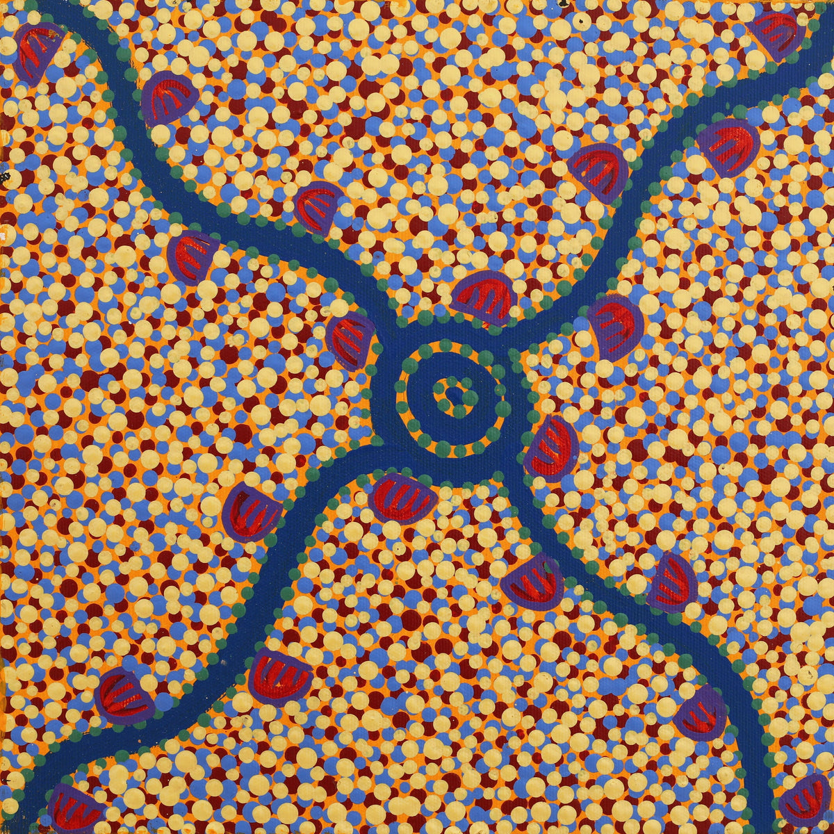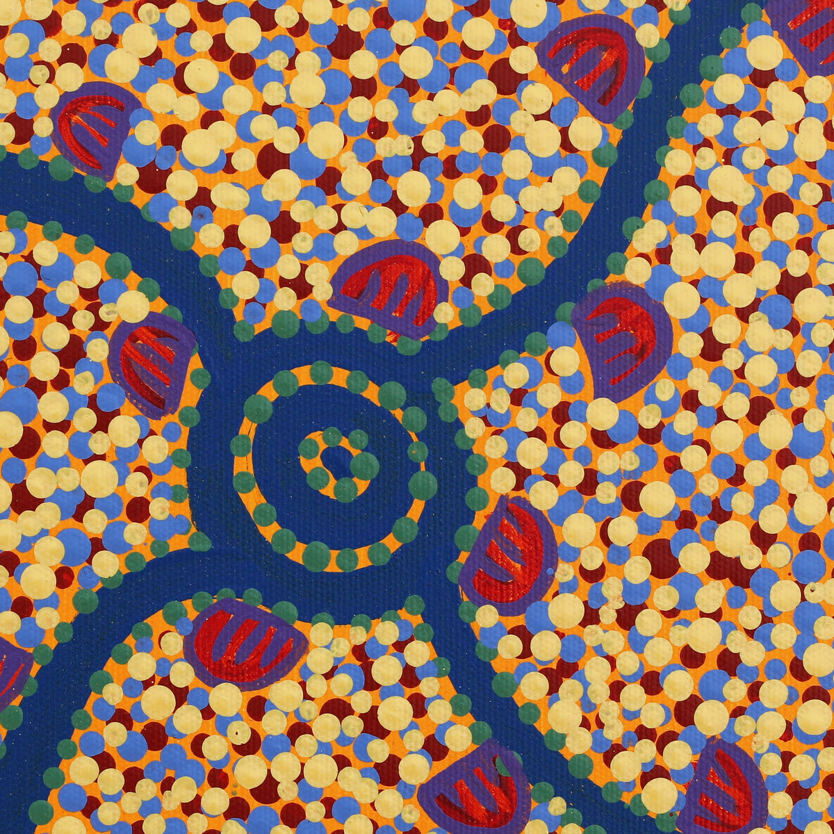 Melissa Napangardi began painting with Warlukurlangu Artists Aboriginal Corporation, an Aboriginal owned and governed art centre located in Yuendumu, since 2004. She paints her Father’s Wanakiji Jukurrpa (Bush Tomato Dreaming), Yarla Jukurrpa (Bush Potato Dreaming) and Yuparli Jukurrpa (Bush Banana Dreaming). She also paints her Mother’s Wardapi Jukurrpa (Goanna Dreaming). These stories were passed down to her by her family and their ancestors before them for millennia. She uses an unrestricted palette to develop a modern interpretation of traditional motifs with her own ideas of design and pattern.
