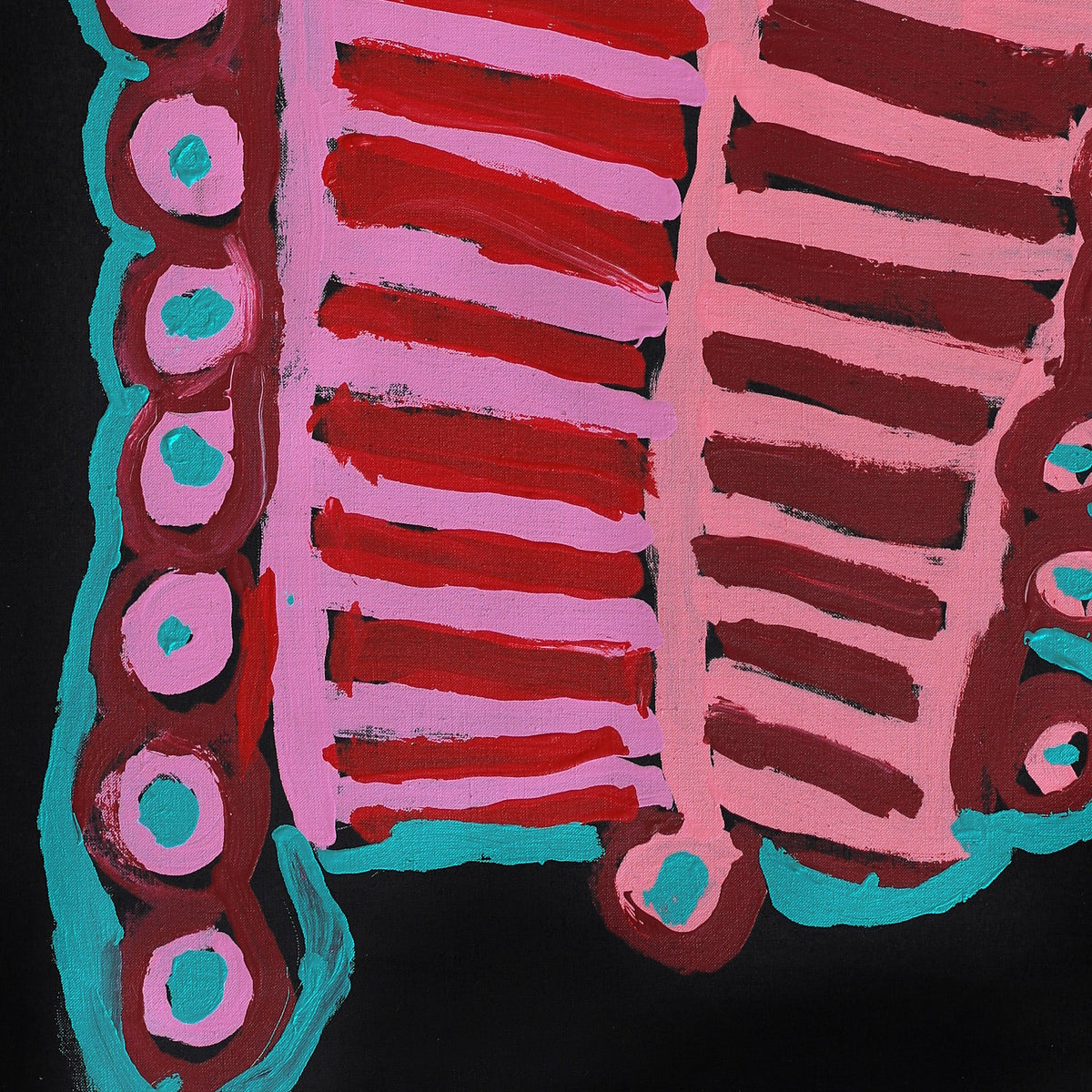 This painting depicts ‘malikijarra Jukurrpa’ (two dogs Dreaming). The ‘kirda’ (owners) of this Dreaming are Nampijinpa/Nangala women and Jampijinpa/Jangala men.