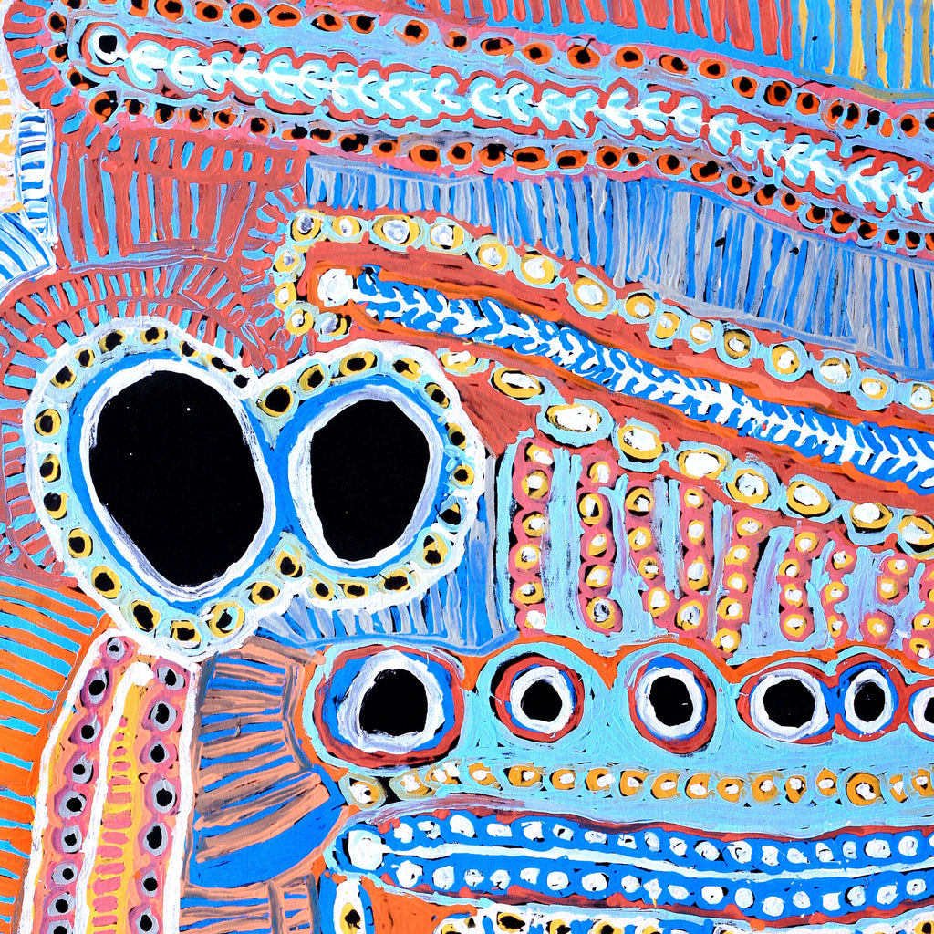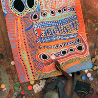 Murdie has been painting with Warlukurlangu Artists Aboriginal Corporation, an Aboriginal owned and governed art centre located in Yuendumu, since 2012. She was prompted to paint when she attended a workshop in 2012. She enjoys painting, and paints her father’s jukurrpa,Maliki Jukurrpa (Domestic Dog Dreaming) andMalikijarra Jukurrpa (Two Dog Dreaming). Dreamings that have been passed down through the generations for millennia and relate directly to the land, its features and the animals and plants that inhabit it. She uses an unrestricted palette to develop a modern interpretation of her traditional culture.