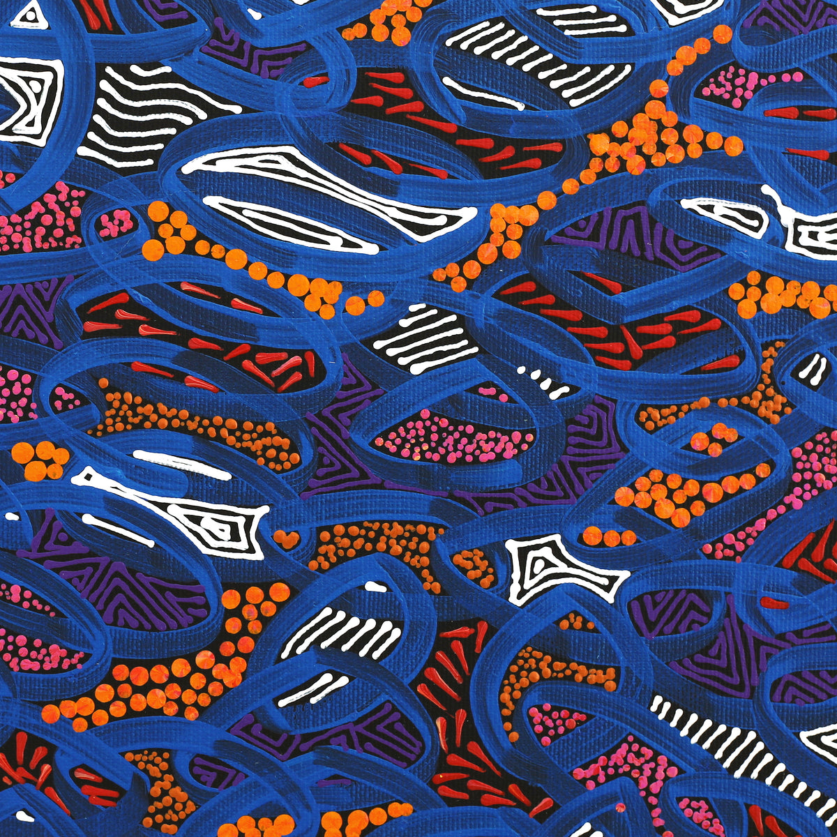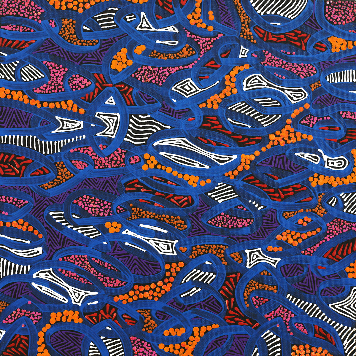 Nathania has been painting with Warlukurlangu Artists Aboriginal Corporation, an Aboriginal owned and governed art centre located in Yuendumu, since 2011. She paints her father’s Jukurrpa, particularly Ngapa Jukurrpa (Water Dreaming) and her mother’s Jukurrpa, Yankirri Jukurrpa (Emu Dreaming. These stories have been passed down over the generations for millennia and relate directly to the land, its features and the plants and animals that inhabit it. Nathania uses an unrestricted palette to depict a modern interpretation of her traditional culture.