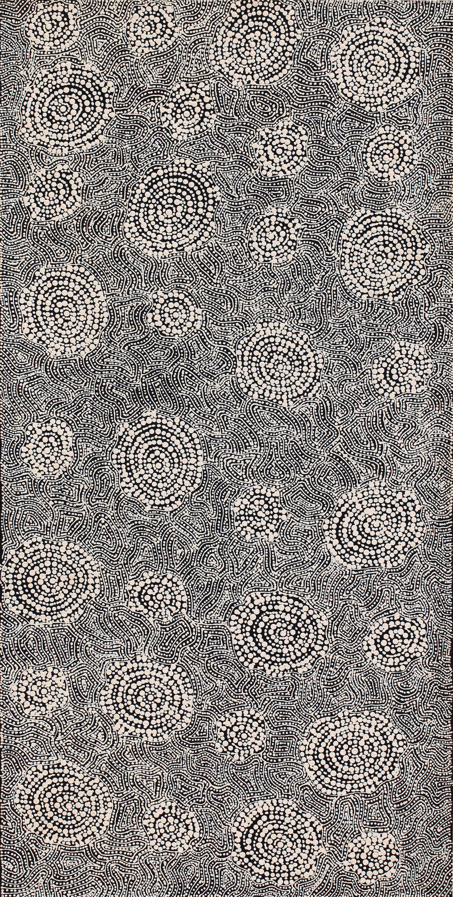 Nathania has been painting with Warlukurlangu Artists Aboriginal Corporation, an Aboriginal owned and governed art centre located in Yuendumu, since 2011. She paints her father’s Jukurrpa, particularly Ngapa Jukurrpa (Water Dreaming) and her mother’s Jukurrpa, Yankirri Jukurrpa (Emu Dreaming. These stories have been passed down over the generations for millennia and relate directly to the land, its features and the plants and animals that inhabit it. Nathania uses an unrestricted palette to depict a modern interpretation of her traditional culture.