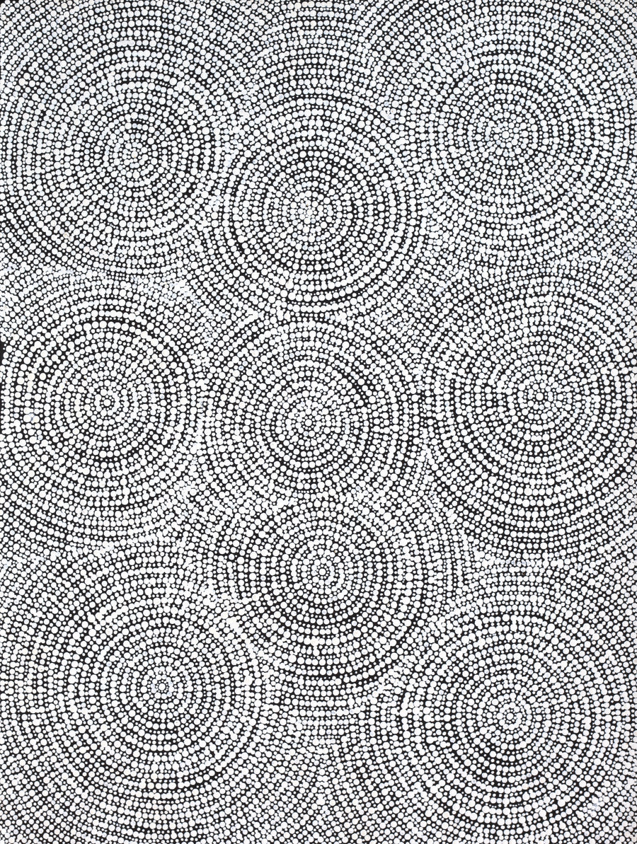 The place depicted in this painting, Ngama, is located south of Yuendumu in the Northern Territory. This Dreaming belongs to Nakamarra/Napurrurla women and Jakamarra/Jupurrurla men. This story describes the journey of Yarripiri, an ancestral ‘warna’ (snake). He travelled from Wirnparrku near Mt. Liebig to Yimparlu, and continued its way through the territories of Ngapanangka-jarra, Warlajirryi, Kurnmundu, Yinyirrinyi on to Ngama. Later Yarripiri travelled further north via Mijirlparnta (Mission Creek) and right through to the top end of Australia.Yarripiri was very sad as his family had left him behind at Wirnparrku. He was blind and crippled but he was determined to follow and search them out. He had to be carried. This was the job undertaken by the ‘kurdungurlu’ (ceremonial police) of the Dreaming: the Nangala/Nampijinpa women and Jangala/Jampijinpa men. Where Yarripiri's tail slumped and touched the ground creeks were formed, such as Mijirlparnta, west of Yuendumu. Yarripiri tracks and paths are often represented by arc shapes or curved lines depicted across the canvas.