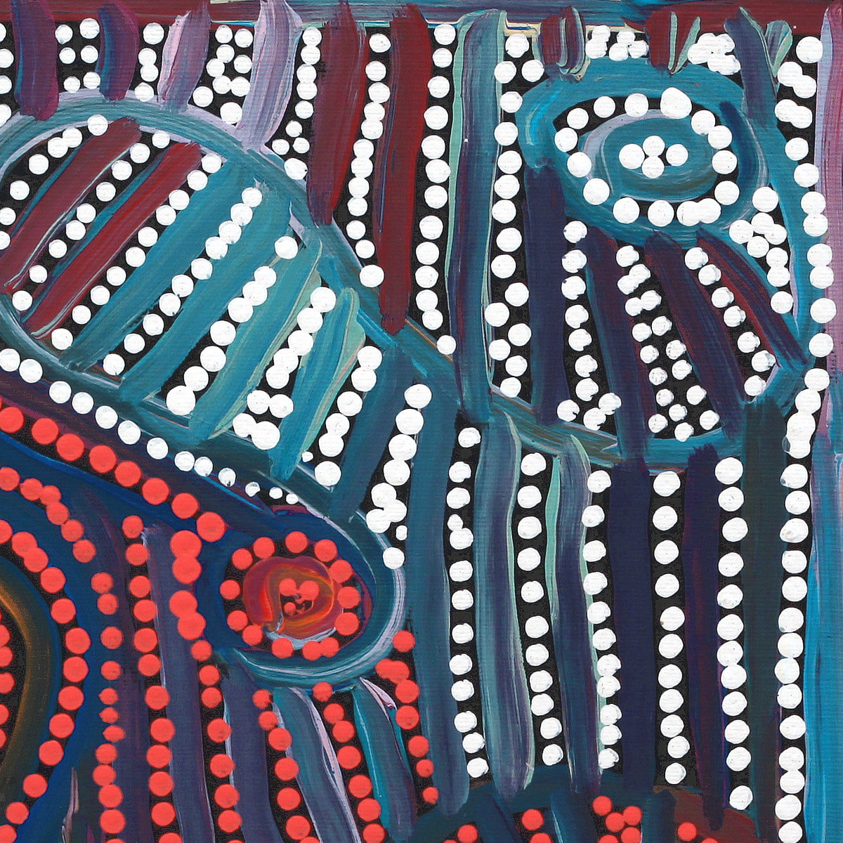 This ‘Jukurrpa’ (Dreaming) comes from Mina Mina, a very important women’s Dreaming site far to the west of Yuendumu near Lake Mackay and the WA border. The ‘kirda’ (owners) of this Dreaming are Napangardi/Napanangka women and Japangardi/Japanangka men; the area is sacred to Napangardi and Napanangka women. There are a number of ‘mulju’ (water soakages) and a ‘maluri’ (clay pan) at Mina Mina.