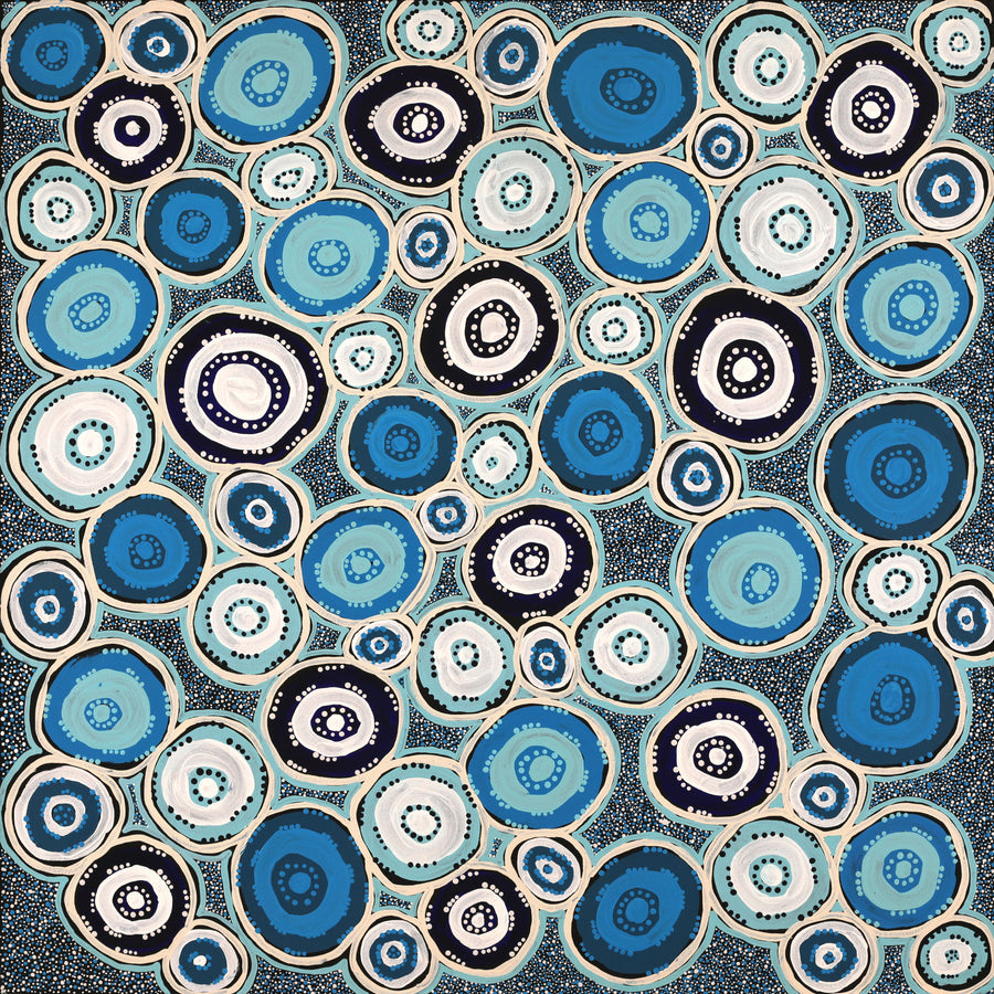 This artwork comes from Iwiṟi Arts, an Aṉangu-led organisation in Adelaide established by Aṉangu who had moved from remote communities due to limited services and chronic health needs. The studio supports artists visiting or living in the city from the APY Lands, helping maintain strong cultural connection to Country, language and Tjukurpa while away from homelands.