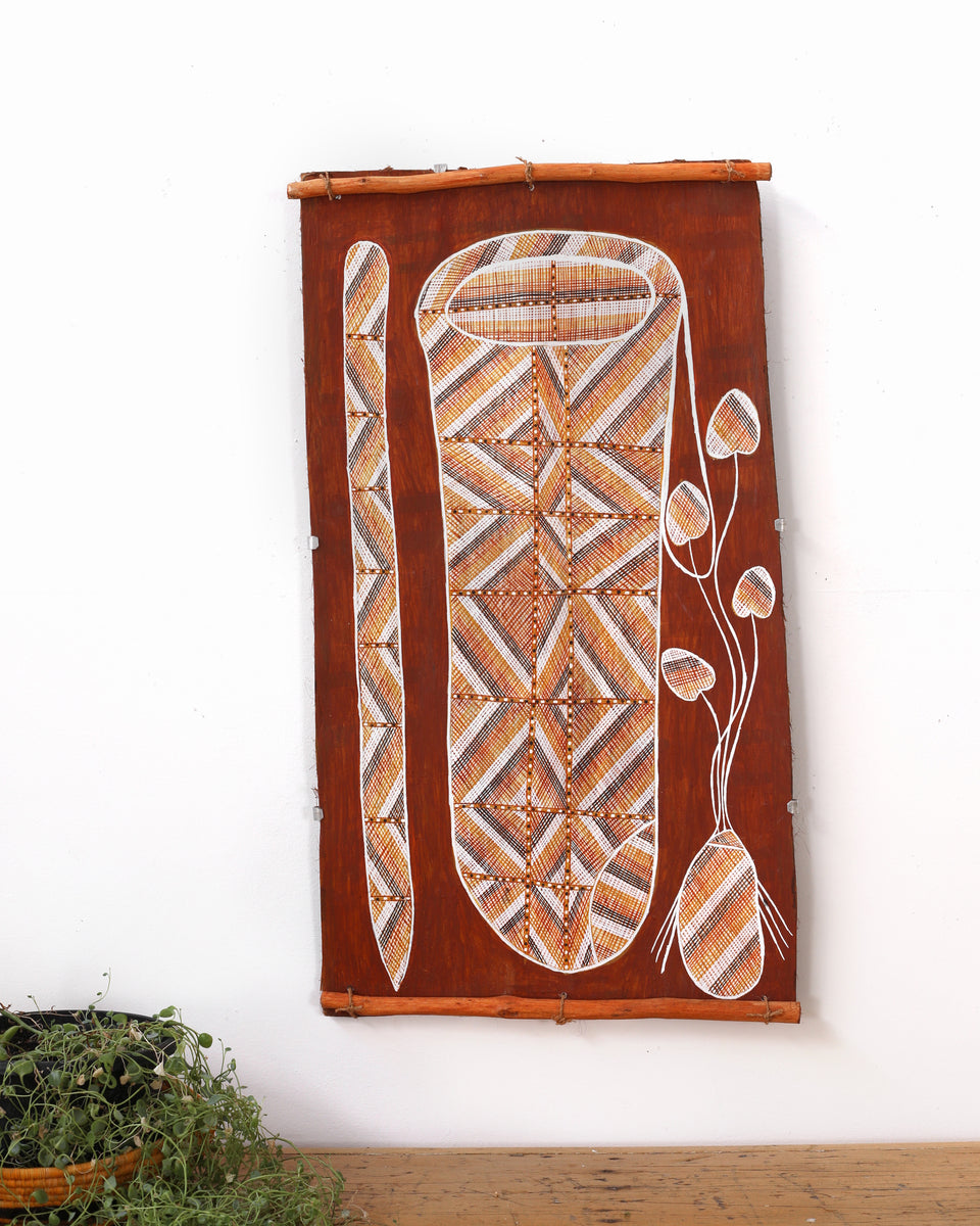 Raphael Wurrkidj, Kun-madj - Large Dillybag Vine, 76x41cm Bark Painting