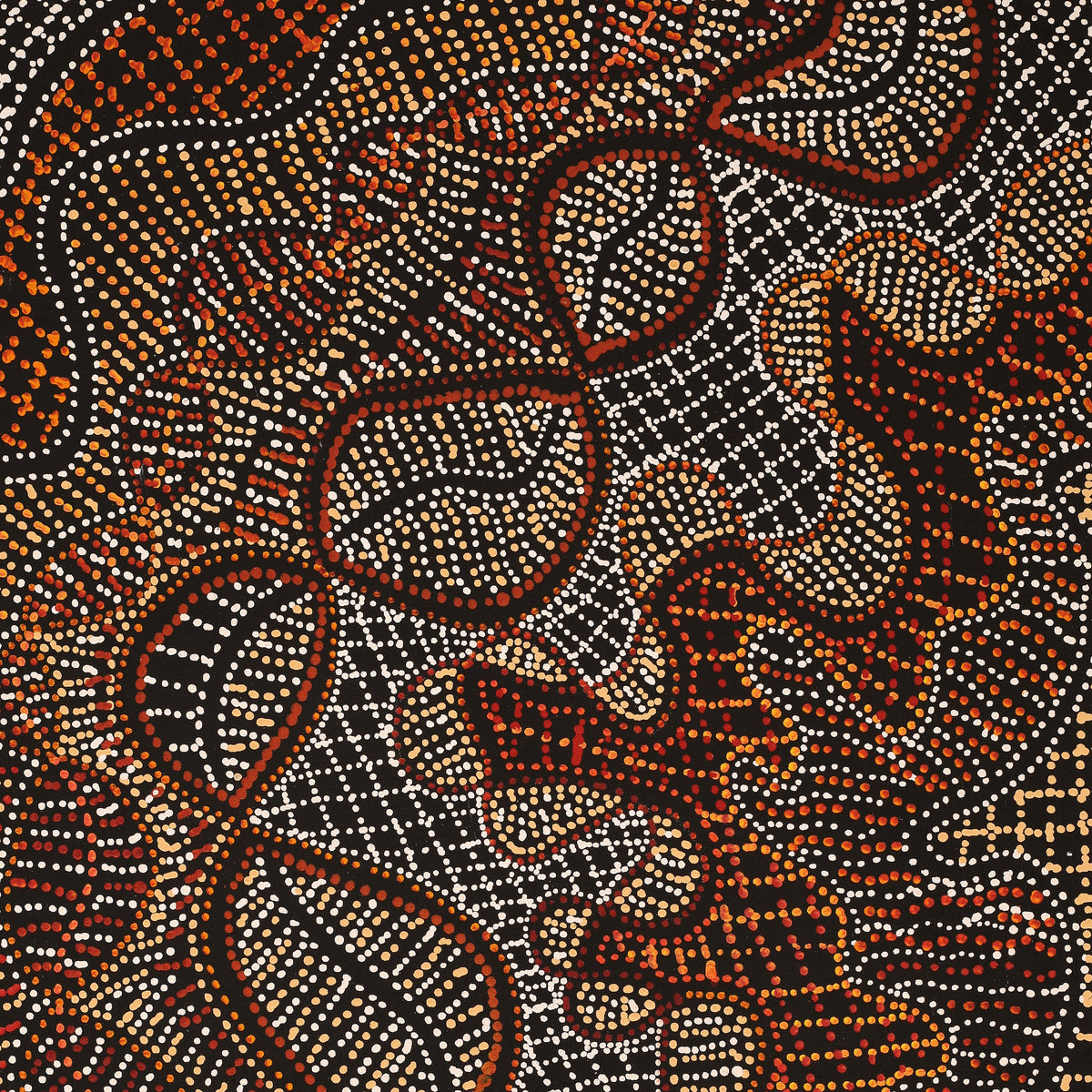 This painting depicts the Pamapardu Jukurrpa (Flying Ant Dreaming) from Warntungurru, west of Yuendumu. 'Pamapardu' is the Warlpiri name for the flying ants or termites that build the large anthills found throughout Warlpiri country. This country belongs to Nakamarra/Napurrurla women and Jakamarra/Jupurrurla men. 'Pamapardu' are flying ants. They build earth mounds (‘mingkirri’) that are common in the Tanami area. When heavy rains come in summer the ‘mingkirri’ get flooded out, so the ‘pamapardu’ grow wings and fly off to make new homes, following their queens to dry mounds or to build a new. When they have found their new home they drop their wings. In this stage they can be collected, lightly cooked in coals and eaten. As they fall to the ground women collect them to eat because they are nice and sweet. In contemporary Warlpiri paintings traditional iconography is used to represent the Jukurrpa, particular sites and other elements. When this Jukurrpa story is painted concentric circles are used to represent the ‘mingkirri’ and the rockholes involved in the story, including the central one at Wapurtali (Mt Singleton). Dashes are often depicted around the circles to represent the ‘pamapardu’.