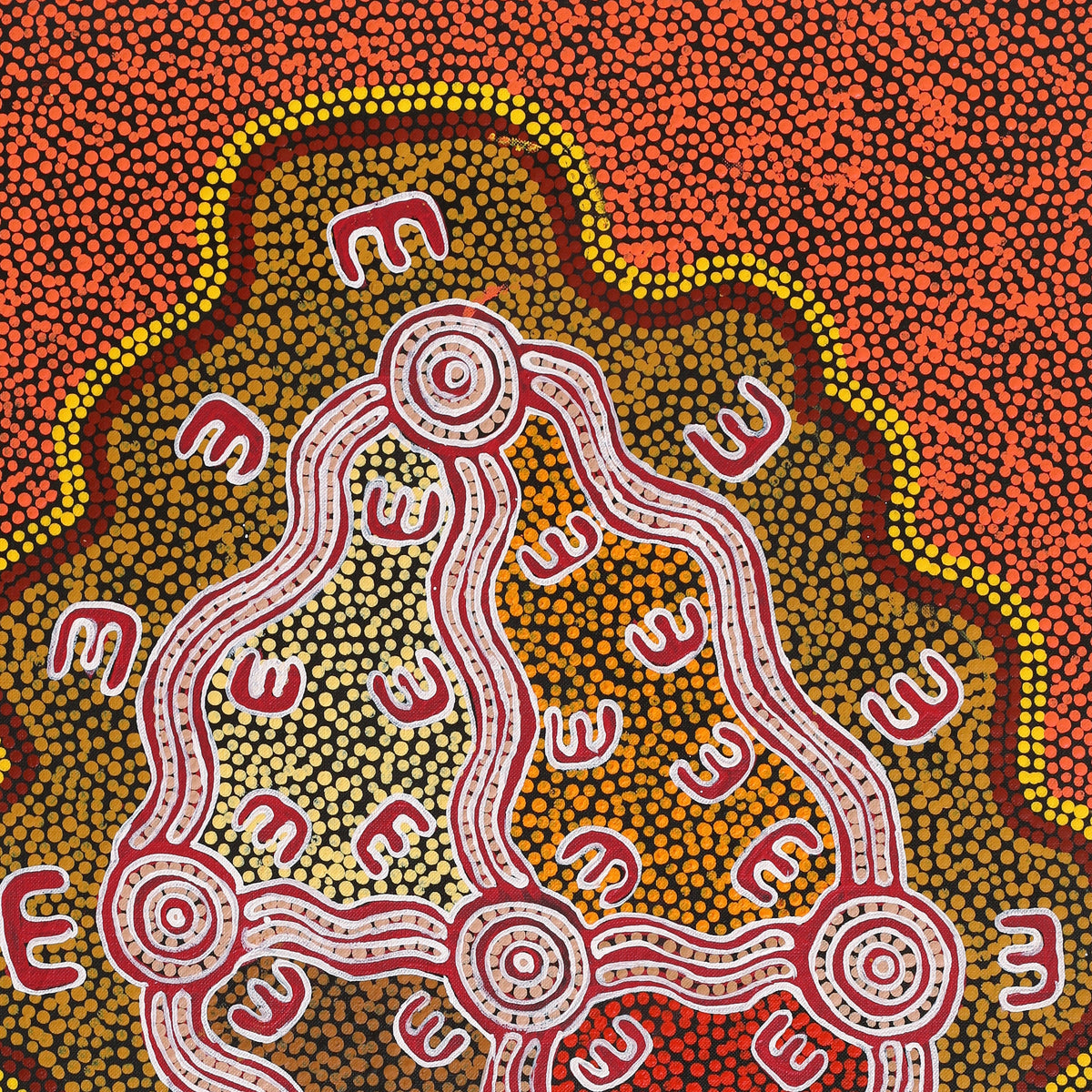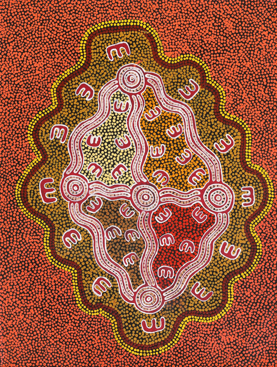Janganpa Jukurrpa (common brush-tail possum [Trichosurus vulpecula] Dreaming) travels all over Warlpiri country. ‘Janganpa’ are nocturnal animals that often nest in the hollows of white gum trees (‘wapunungka’). This story comes from a big hill called Mawurrji, west of Yuendumu and north of Pikilyi (Vaughan Springs). A group of ‘janganpa’ ancestors resided there. Every night they would go out in search of food. Their hunting trips took them to Wirlki and Wanapirdi, where they found ‘pamapardu’ (flying ants). They journeyed on to Ngarlkirdipini looking for water. A Nampijinpa women was living at Mawurrji with her two daughters. She gave her daughters in marriage to a Jupurrurla ‘janganpa’ but later decided to run away with them. The Jupurrurla angrily pursued the woman. He tracked them to Mawurrji where he killed them with a stone axe. Their bodies are now rocks at this place. Warlpiri people perform a young men’s initiation ceremony, which involves the Janganpa Jukurrpa. The Janganpa Jukurrpa belongs to Jakamarra/Jupurrurla men and Nakamarra/Napurrurla women. In Warlpiri paintings traditional iconography is used to represent this Jukurrpa. ‘Janganpa’ tracks are often represented as 'E' shaped figures and concentric circles are used to depict the trees in which the ‘janganpa’ live, and also the sites at Mawurrji.