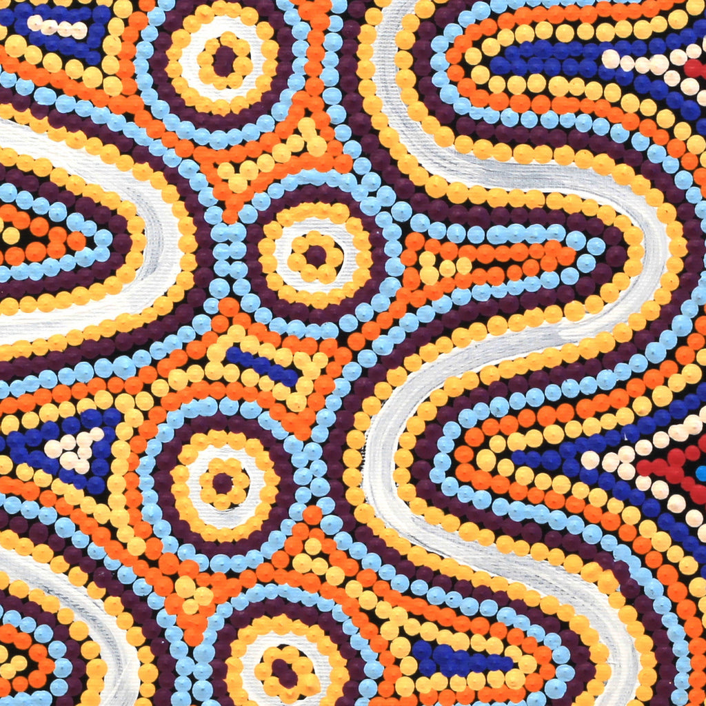 The place depicted in this painting, Ngama, is located south of Yuendumu in the Northern Territory. This Dreaming belongs to Nakamarra/Napurrurla women and Jakamarra/Jupurrurla men. This story describes the journey of Yarripiri, an ancestral ‘warna’ (snake). He travelled from Wirnparrku near Mt. Liebig to Yimparlu, and continued its way through the territories of Ngapanangka-jarra, Warlajirryi, Kurnmundu, Yinyirrinyi on to Ngama. Later Yarripiri travelled further north via Mijirlparnta (Mission Creek) and right through to the top end of Australia.Yarripiri was very sad as his family had left him behind at Wirnparrku. He was blind and crippled but he was determined to follow and search them out. He had to be carried. This was the job undertaken by the ‘kurdungurlu’ (ceremonial police) of the Dreaming: the Nangala/Nampijinpa women and Jangala/Jampijinpa men. Where Yarripiri's tail slumped and touched the ground creeks were formed, such as Mijirlparnta, west of Yuendumu. Yarripiri tracks and paths are often represented by arc shapes or curved lines depicted across the canvas.