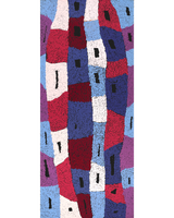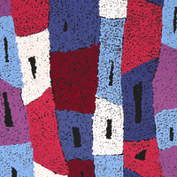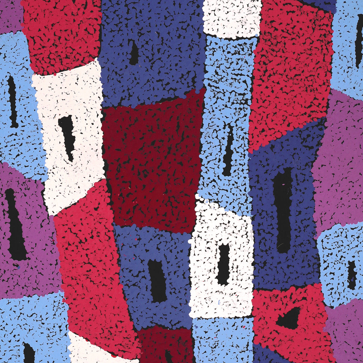 This painting depicts the natural landscape around Nyirrpi, a small Warlpiri community (originally an outstation) about 160 km west of Yuendumu. About 200 people live in Nyirrpi today. The bush around Nyirrpi features plenty of ‘watiya’ (trees), ‘marna’ (grass), ‘kuyu’ (animals) to hunt, and ‘miyi’ (edible plants) to gather.
