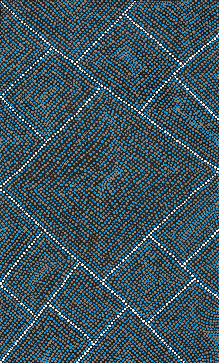 Samara began painting with the Warlukurlangu Artists Aboriginal Corporation, an Aboriginal owned and governed art centre located in Yuendumu, in 2007. She paints her dad’s Ngapa Jukurrpa (Water Dreaming), Ngalyipi Jukurrpa (Snake Vine Dreaming), Yankirri Jukurrpa (Emu Dreaming) and Warna Jukurrpa (Snake Dreaming). She occasionally paints her Aunty’s Kanta Jukurrpa (Bush Coconut Dreaming) and her Mum’s Watiya-warnu Jukurrpa (Seed Dreaming). These ‘dreamings’ relate directly to her land, its features and the plants and animals that inhabit it. These stories were passed down to her by her family and their parents before them for millennia.She uses colour and patterns which she creatively combines to blend traditional motifs with her own ideas of modern design to represent her country.