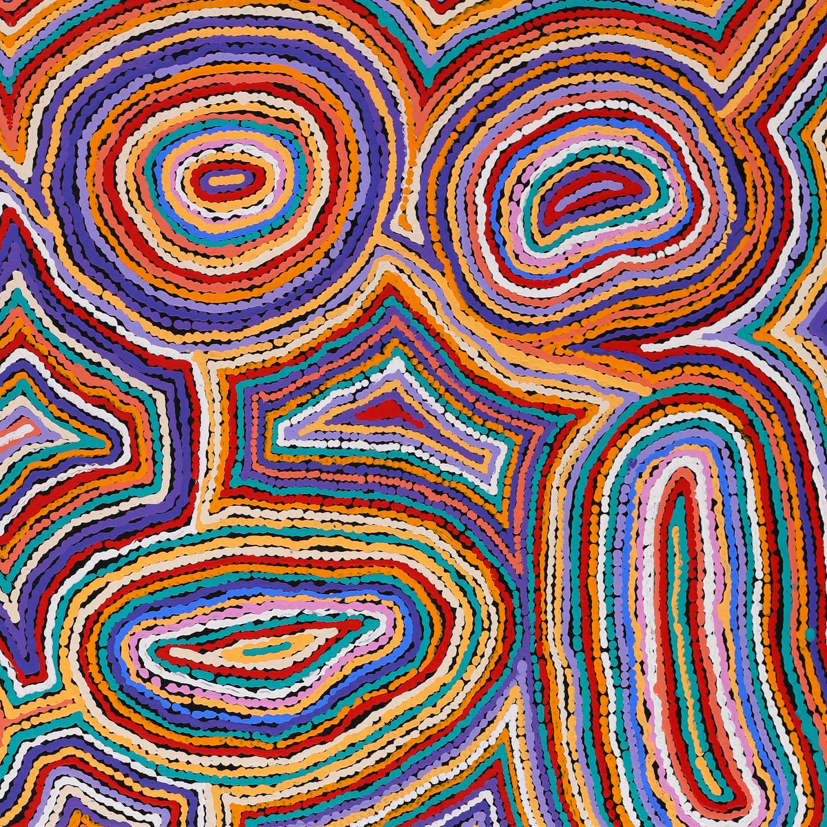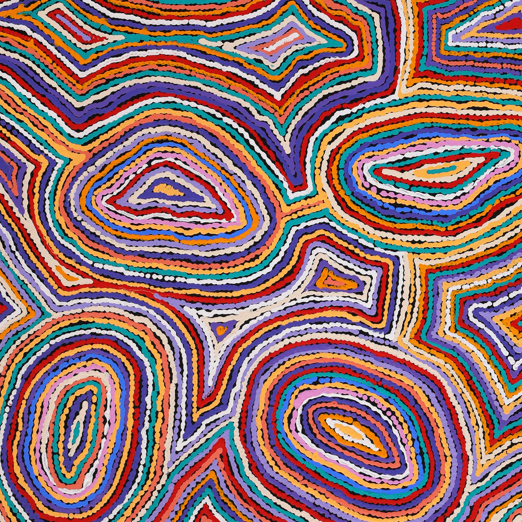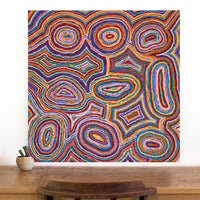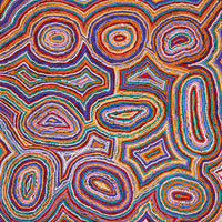 Sarah began painting with Warlukurlangu Artists Aboriginal Corporation, an Aboriginal owned and governed art centre located in Yuendumu, in 2013. The Art Centre makes regular visits to Nyirripi to drop off canvas, paint and brushes for the artists and to collect finished artwork. She paints her Grandmother’s Jukurrpa, stories about women’s ceremony held near Pikilyi (Vaughan Springs). ”I use to watch my grandmother paint and listen to her stories.” These stories have been passed down through generations for millennia and relate directly to the land, its features and the plants and animals that inhabit it. Sara finds painting relaxing and uses an unrestricted palette to develop a modern interpretation of her traditional culture.