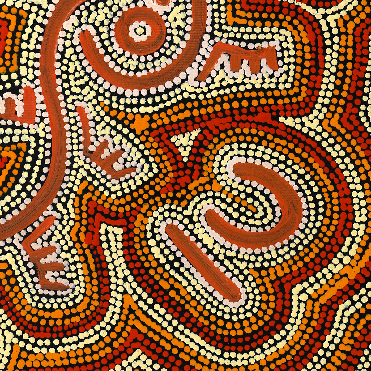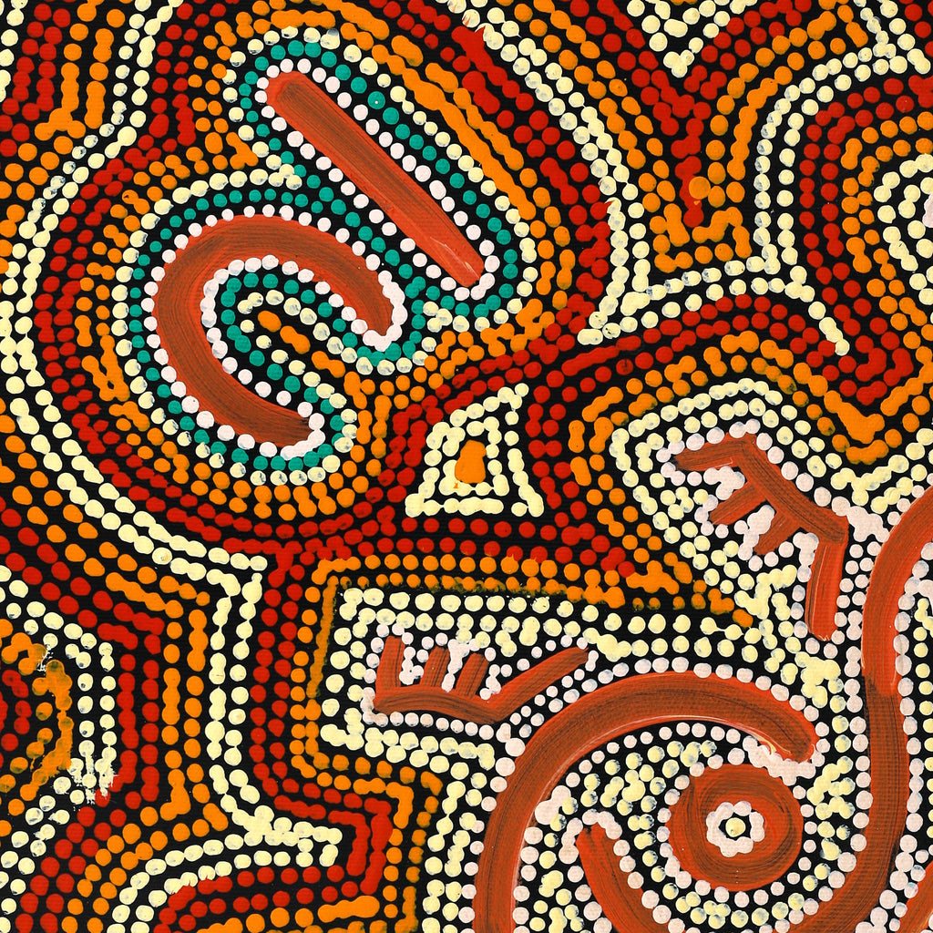 Sebastian has been painting with Warlukurlangu Artists Aboriginal Corporation, an Aboriginal owned and governed art centre located in Yuendumu, since 2009. He paints his Father’s Wardapi Jukurrpa (Goanna Dreaming) – Yarripilangu and his Mother’s Ngapa Jukurrpa (Water Dreaming). These stories relate directly to his land, its features and the plants and animals that inhabit it. Sebastian uses an unrestricted palette and traditional iconology that stretches back at least fifty millennia to depict his traditional Jukurrpa.