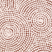 This Jukurrpa belongs to women of the Nakamarra/Napurrurla subsections and to Jakamarra/Jupurrurla men. This Dreaming is associated with a place called Jaralypari, north of Yuendumu. Lukarrara (desert fringe-rush [Fimbristylis oxystachya & Fimbristylis eremophila]) is a grass with an edible seed. The seeds are traditionally ground on a large stone (‘ngatinyanu’) with a smaller stone (‘ngalikirri’) to make flour. This flour is mixed with water (‘ngapa’) to make damper cakes which are cooked and eaten. In Warlpiri traditional paintings iconography is used to represent the Jukurrpa, particular sites and other elements. Large concentric circles often represent the site of Jaralypari and also the seed bearing grass Lukurrara. ‘U’ shapes can depict the Karnta (women) collecting ‘lukarrara’ and straight lines are frequently used to portray seeds that fall down to the ground and are also collected by women using their ‘parrajas’ (wooden food carriers) and ‘karlangu’ (digging sticks).
