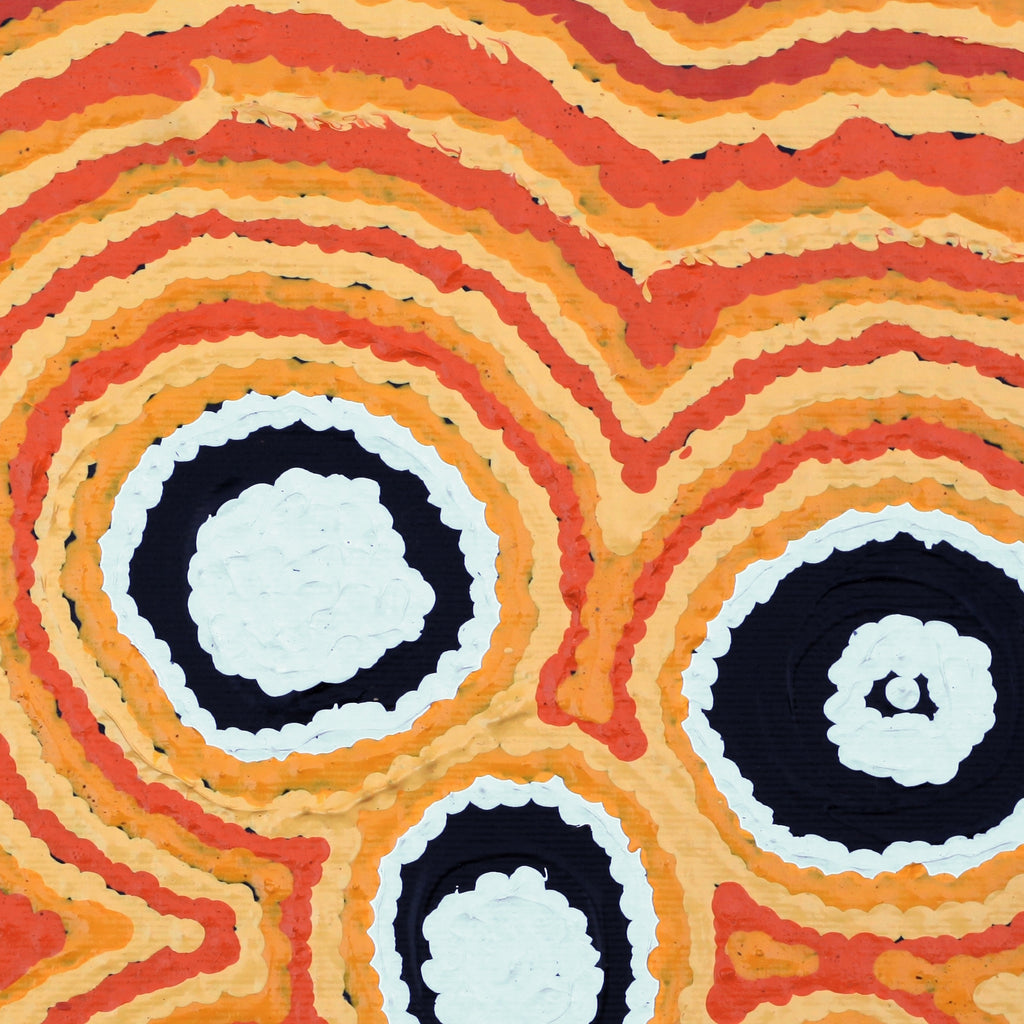 The site depicted in this painting is Puyurru, west of Yuendumu. In the usually dry creek beds are ‘mulju’ (soakages), or naturally occurring wells. The 'kirda' (owners) for this site are Nangala/Nampijinpa women and Jangala/Jampijinpa men. Two Jangala men, rainmakers, sang the rain, unleashing a giant storm. The storm travelled across the country from the east to the west, initially travelling with a ‘pamapardu Jukurrpa’ (termite Dreaming) from Warntungurru to Warlura, a waterhole 8 miles east of Yuendumu. At Warlura, a gecko called Yumariyumari blew the storm on to Lapurrukurra and Wilpiri. Bolts of lightning shot out at Wirnpa (also called Mardinymardinypa) and at Kanaralji. At this point the Dreaming track also includes the ‘kurdukurdu mangkurdu Jukurrpa’ (children of the clouds Dreaming). The water Dreaming built hills at Ngamangama using baby clouds and also stuck long pointy clouds into the ground at Jukajuka, where they can still be seen today as rock formations.