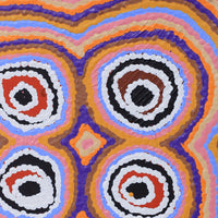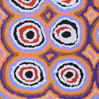 The site depicted in this painting is Puyurru, west of Yuendumu. In the usually dry creek beds are ‘mulju’ (soakages), or naturally occurring wells. The 'kirda' (owners) for this site are Nangala/Nampijinpa women and Jangala/Jampijinpa men. Two Jangala men, rainmakers, sang the rain, unleashing a giant storm. The storm travelled across the country from the east to the west, initially travelling with a ‘pamapardu Jukurrpa’ (termite Dreaming) from Warntungurru to Warlura, a waterhole 8 miles east of Yuendumu. At Warlura, a gecko called Yumariyumari blew the storm on to Lapurrukurra and Wilpiri. Bolts of lightning shot out at Wirnpa (also called Mardinymardinypa) and at Kanaralji. At this point the Dreaming track also includes the ‘kurdukurdu mangkurdu Jukurrpa’ (children of the clouds Dreaming). The water Dreaming built hills at Ngamangama using baby clouds and also stuck long pointy clouds into the ground at Jukajuka, where they can still be seen today as rock formations.