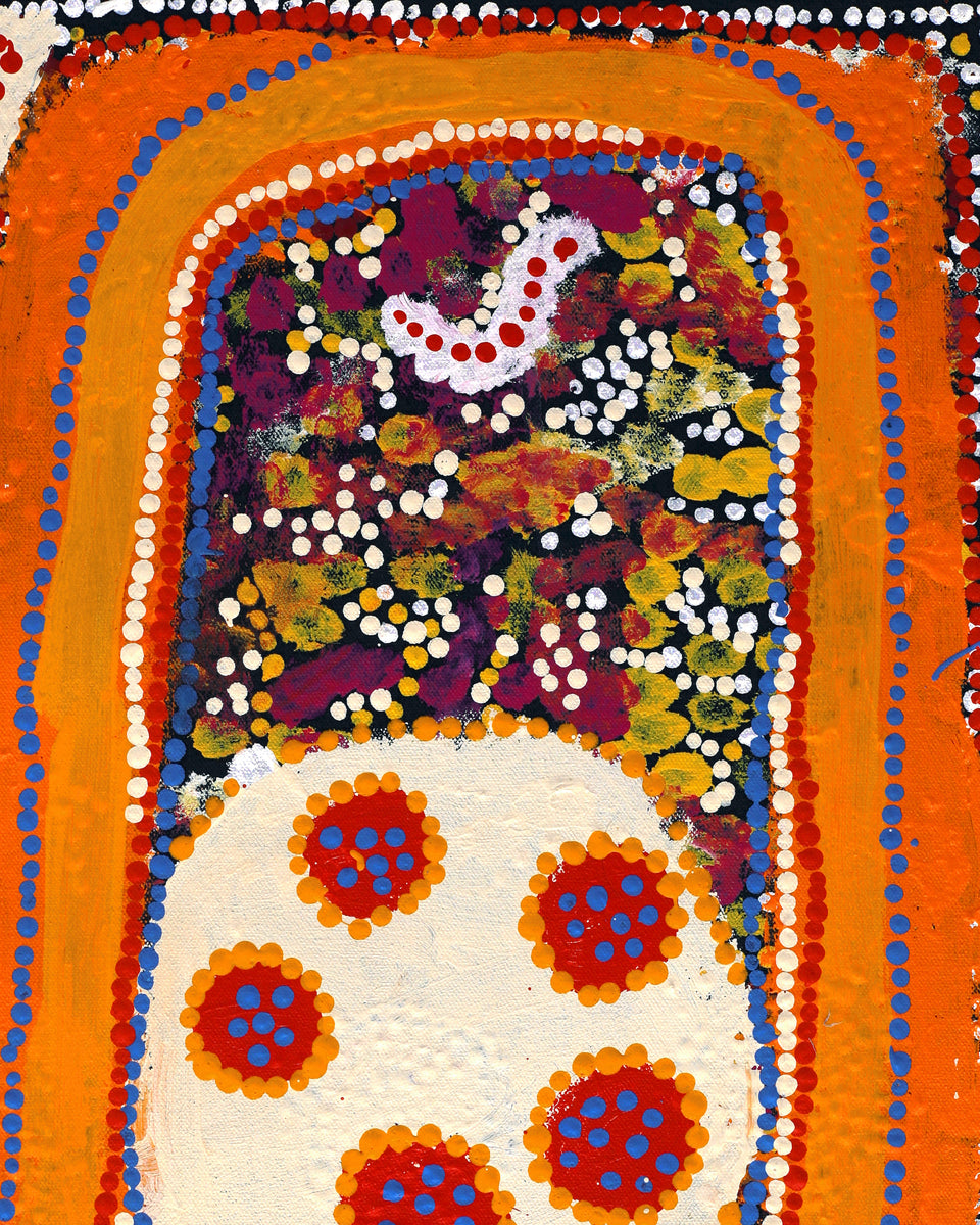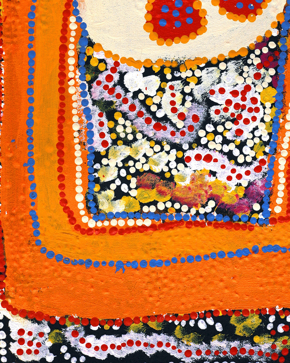 The site depicted in this painting is Puyurru, west of Yuendumu. In the usually dry creek beds are ‘mulju’ (soakages), or naturally occurring wells. The 'kirda' (owners) for this site are Nangala/Nampijinpa women and Jangala/Jampijinpa men. Two Jangala men, rainmakers, sang the rain, unleashing a giant storm. The storm travelled across the country from the east to the west, initially travelling with a ‘pamapardu Jukurrpa’ (termite Dreaming) from Warntungurru to Warlura, a waterhole 8 miles east of Yuendumu. At Warlura, a gecko called Yumariyumari blew the storm on to Lapurrukurra and Wilpiri. Bolts of lightning shot out at Wirnpa (also called Mardinymardinypa) and at Kanaralji. At this point the Dreaming track also includes the ‘kurdukurdu mangkurdu Jukurrpa’ (children of the clouds Dreaming). The water Dreaming built hills at Ngamangama using baby clouds and also stuck long pointy clouds into the ground at Jukajuka, where they can still be seen today as rock formations.