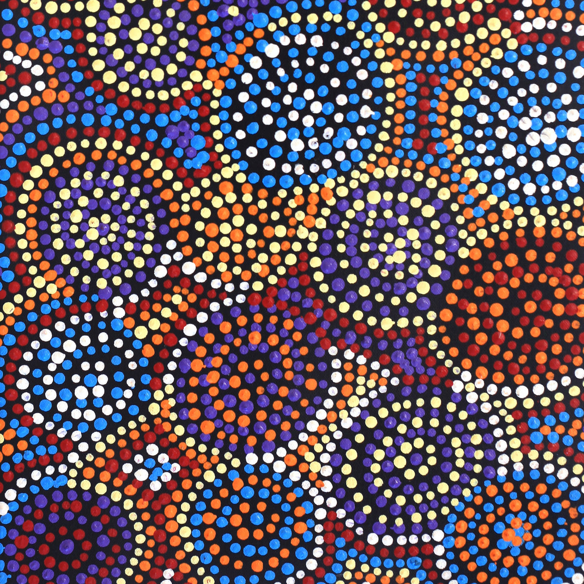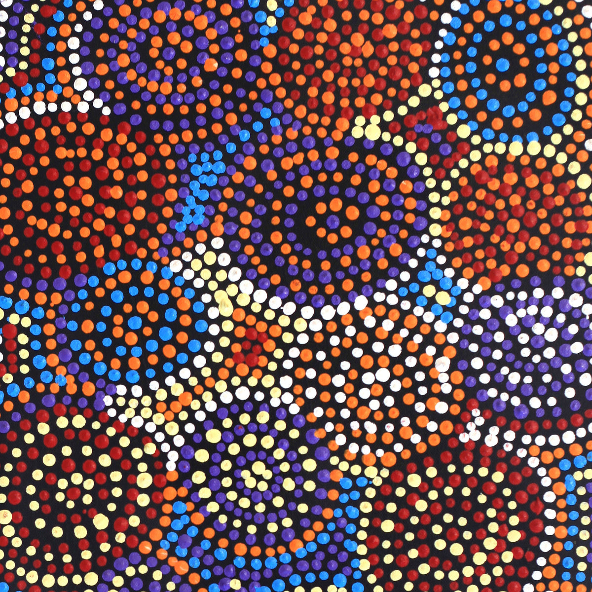 In this painting women of the Napanangka and Napangardi subsection are collecting ‘jinti-parnta’ (edible fungus [Elderia arenivaga]) far to the west of Yuendumu at Karnta Karlangu, near to another place called Mina Mina. ‘Jinti-parnta’ is also known as native truffle and appears in the sandhills after the winter rains. The growing fungus forces the earth above it to crack, exposing it. Then, women collect it, squeezing out the juicie before cooking. Jinti-parnta is prepared by cooking in hot ashes. Ancestral women travelled north through Janyinki and other places, then to the east through to Alcoota country, while collecting ‘jinti-parnta’. They got to Mina Mina, which is a ceremonial place belonging to Japanangka/ Japangardi men and Napanangka/Napangardi women. Their associated land continues far to the west of Yuendumu into sand hill country. There are a number of ‘mulju’ (water soakages) and a large clay pan at Mina Mina and it is at these sites that the women danced and performed ceremonies. As a result ‘karlangu’ (digging sticks) rose up out of the ground, which the women carried with them on their long journey east. They danced and sang the whole way with no sleep. The women collected other types of bush tucker as ‘yakajirri’ (bush sultana). In the paintings of this Dreaming concentric circles are often used to represent the jinti-parnta that the women have collected.