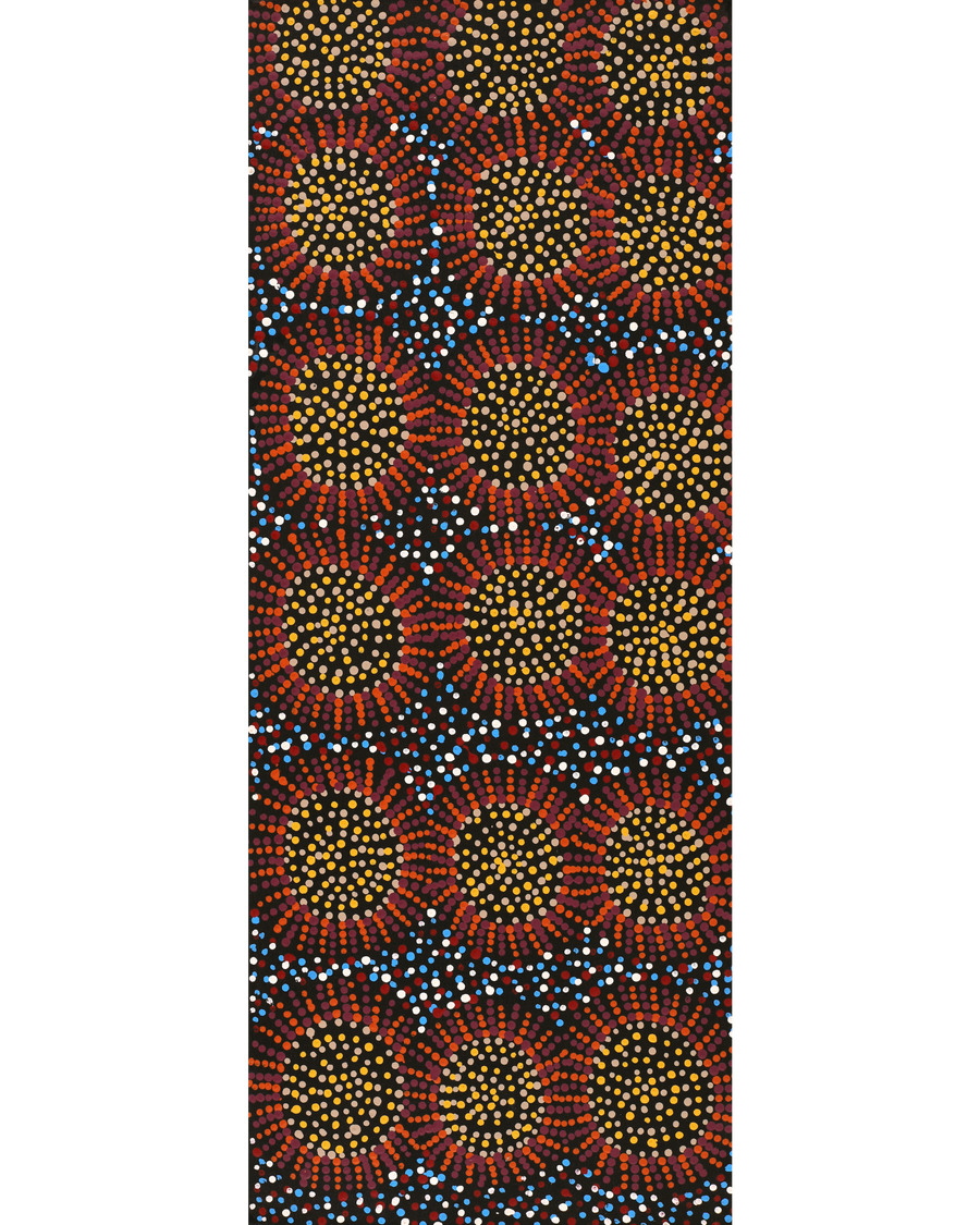 This artwork comes from Warlukurlangu Artists in Yuendumu. The art centre represents Warlpiri artists from Yuendumu and Nyirripi, located in the Tanami Desert northwest of Alice Springs. This remote region of red sand and open desert Country is central to the stories and knowledge shared through the paintings.