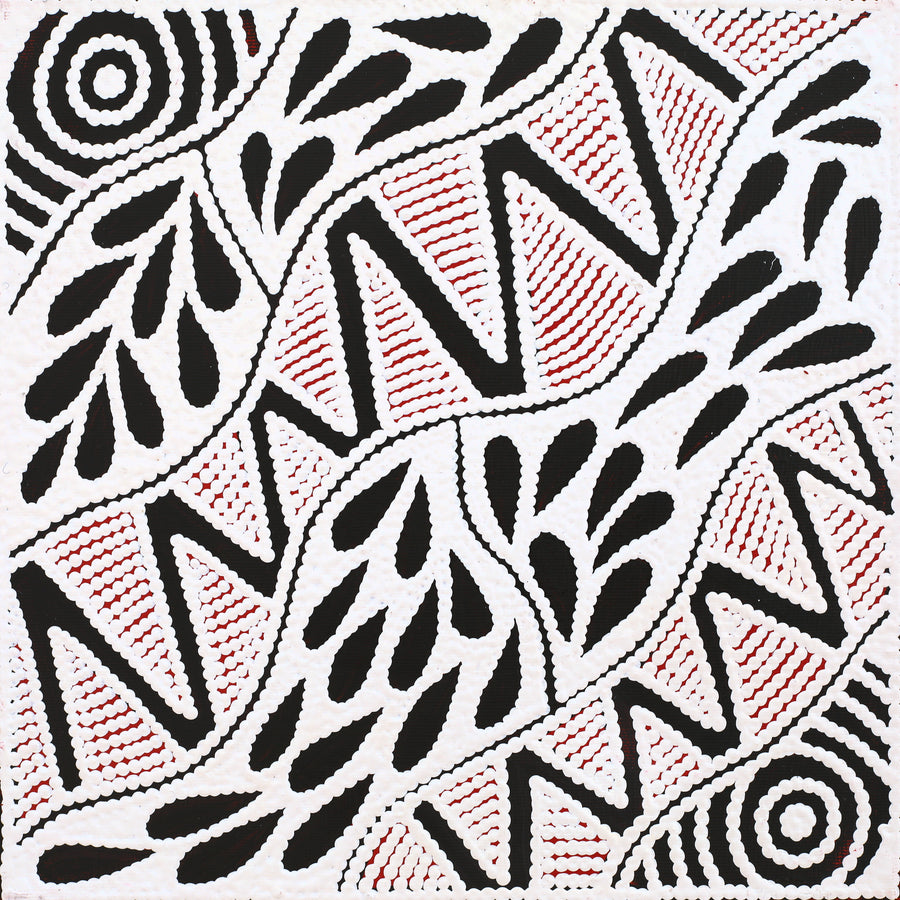 Ursula paints her father’s Yuparli Jukurrpa (Bush Banana Dreaming) and Pikilyi Jukurrpa (Vaughan Springs Dreaming), which her Aunty taught her and her mother’s Ngapa Jukurrpa (Water Dreaming). These dreamings have been passed down the generations for millennia and relate directly to the land, its features and the plants and animals that inhabit it. Ursula uses an unrestricted palette to develop a modern interpretation of her traditional culture.