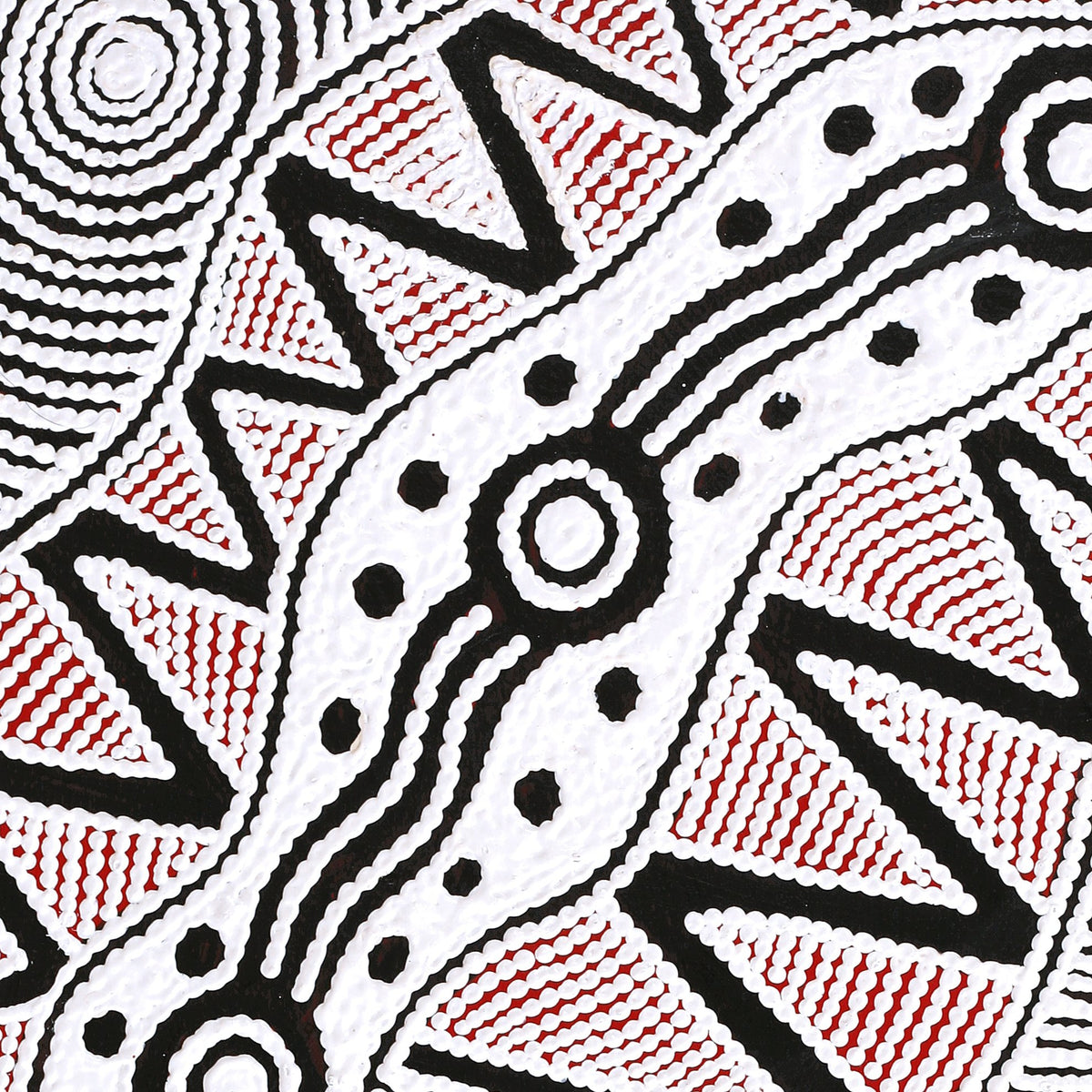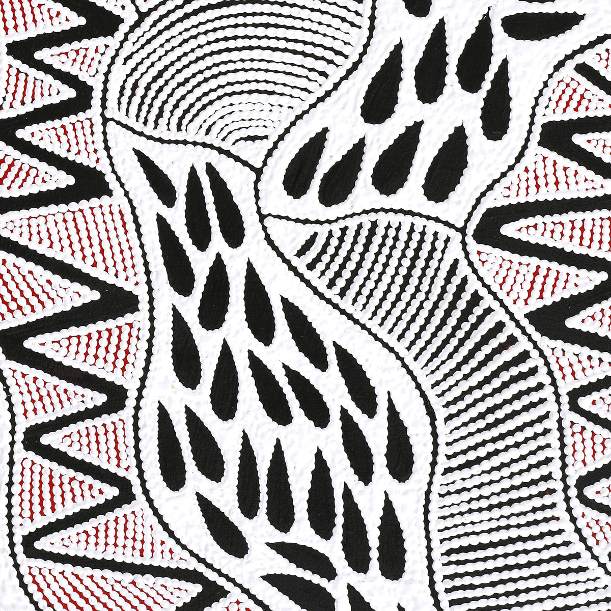 Ursula paints her father’s Yuparli Jukurrpa (Bush Banana Dreaming) and Pikilyi Jukurrpa (Vaughan Springs Dreaming), which her Aunty taught her and her mother’s Ngapa Jukurrpa (Water Dreaming). These dreamings have been passed down the generations for millennia and relate directly to the land, its features and the plants and animals that inhabit it. Ursula uses an unrestricted palette to develop a modern interpretation of her traditional culture.