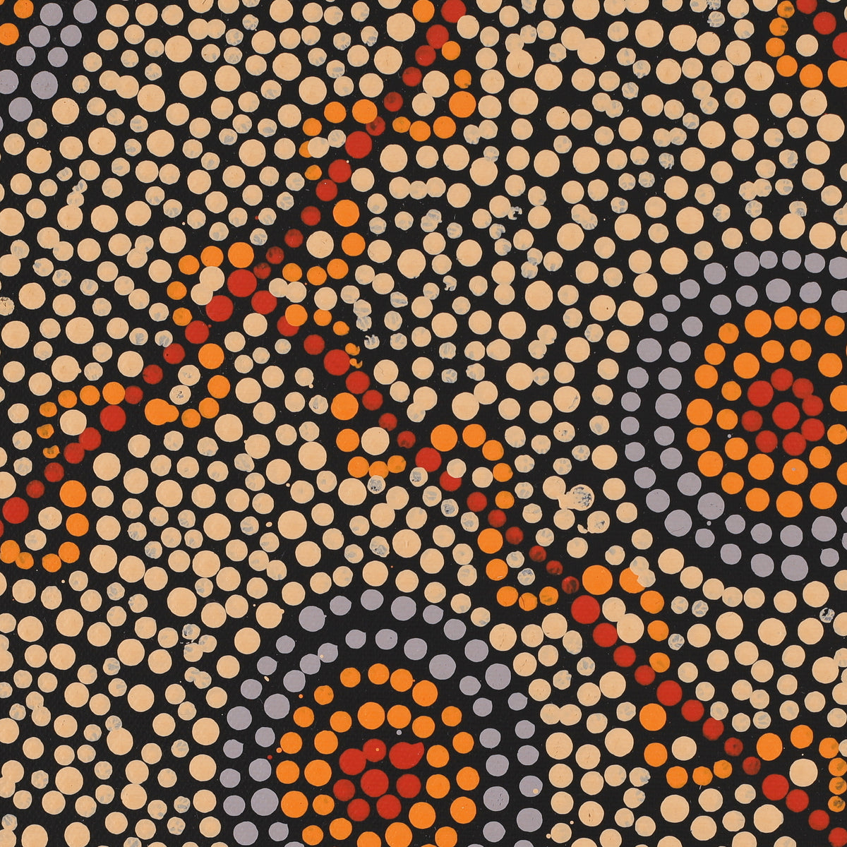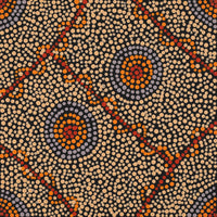 The place depicted in this painting, Ngama, is located south of Yuendumu in the Northern Territory. This Dreaming belongs to Nakamarra/Napurrurla women and Jakamarra/Jupurrurla men. This story describes the journey of Yarripiri, an ancestral ‘warna’ (snake). He travelled from Wirnparrku near Mt. Liebig to Yimparlu, and continued its way through the territories of Ngapanangka-jarra, Warlajirryi, Kurnmundu, Yinyirrinyi on to Ngama. Later Yarripiri travelled further north via Mijirlparnta (Mission Creek) and right through to the top end of Australia.Yarripiri was very sad as his family had left him behind at Wirnparrku. He was blind and crippled but he was determined to follow and search them out. He had to be carried. This was the job undertaken by the ‘kurdungurlu’ (ceremonial police) of the Dreaming: the Nangala/Nampijinpa women and Jangala/Jampijinpa men. Where Yarripiri's tail slumped and touched the ground creeks were formed, such as Mijirlparnta, west of Yuendumu. Yarripiri tracks and paths are often represented by arc shapes or curved lines depicted across the canvas.