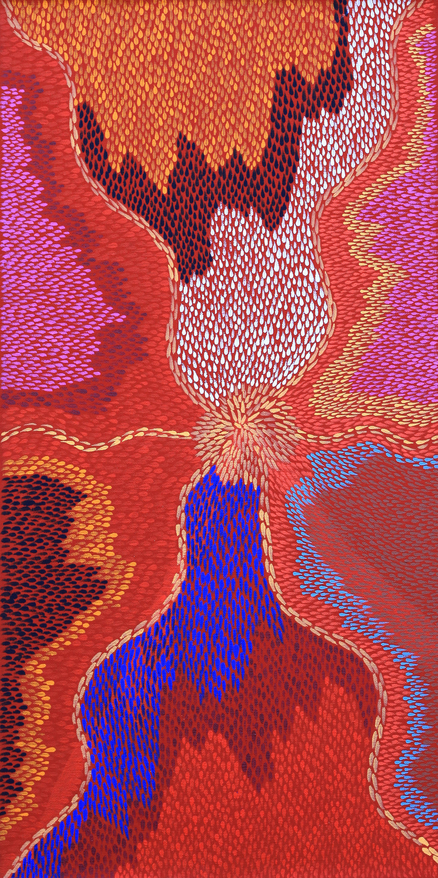 Virgillia is the grand-daughter of acclaimed Ikuntji Artists’ Alice Nampitjinpa who is the grand-daughter of one of the founding members of the acrylic painting movement in Papunya in 1972, Uta Uta Tjangala.