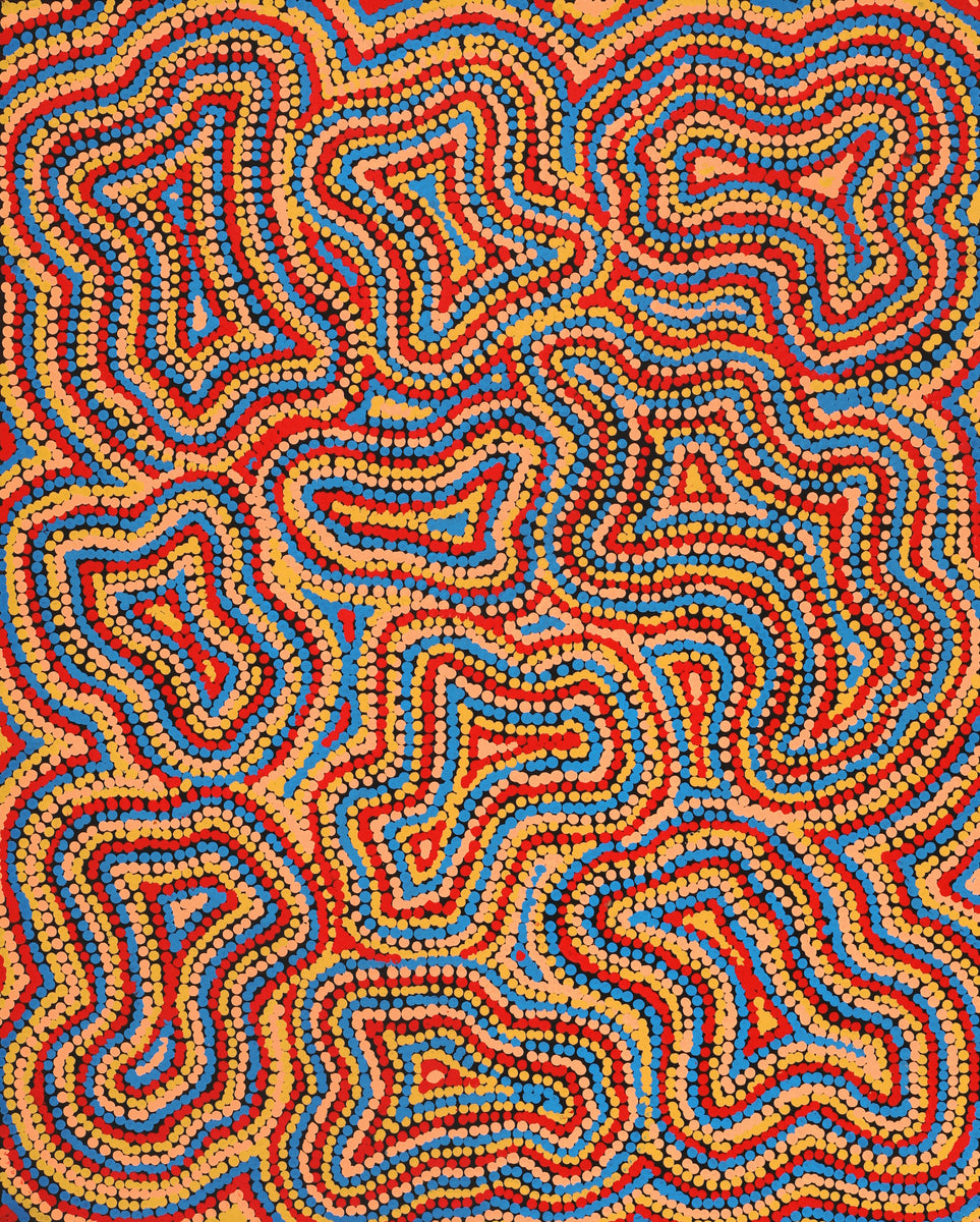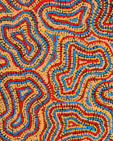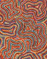 Although she was taught art at school it was her Grandmother that inspired her to paint. When she was young she would listen to her grandmother’s jukurrpa and watch her paint. She began painting with Warlukurlangu Artists Aboriginal Corporation, an Aboriginal owned and governed art centre located in Yuendumu and Nyirripi, in 2017. She paints her Grandmother’s Mina Mina Jukurrpa (Mina Mina Dreaming – Ngalyipi) - a very important women’s dreaming site west of Nyirripi near Lake Mackay and the WA border. These stories have been passed down to her by her grandmother and her grandmother’s mother before her for millennia. Virginia loves colour and uses an unrestricted palette and enjoys painting patterns to depict her jukurrpa.