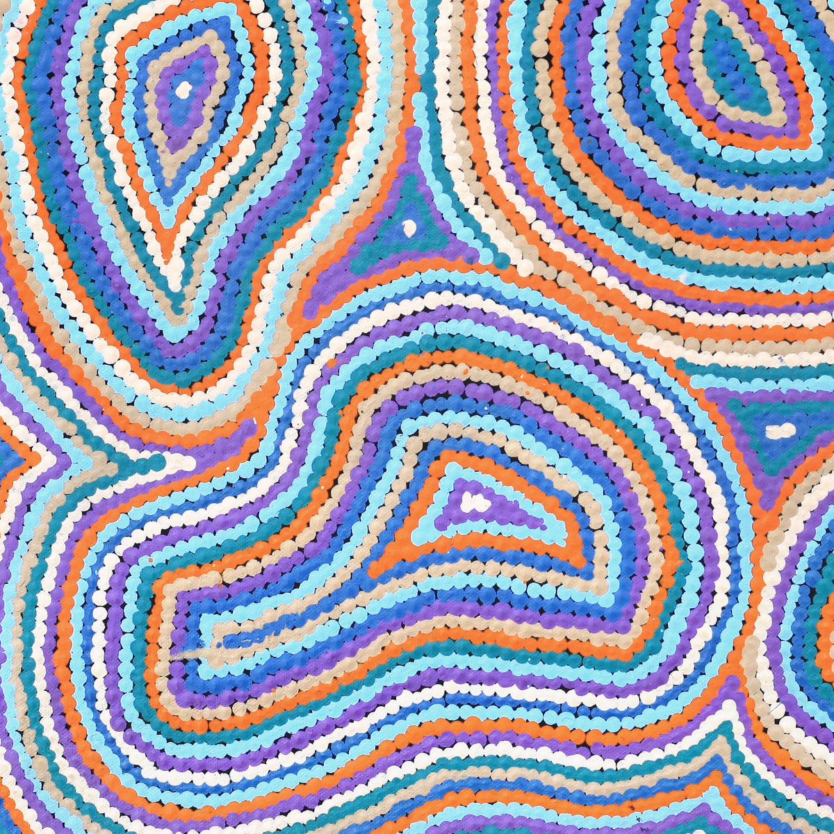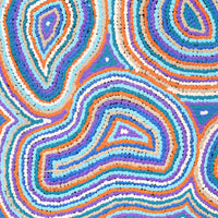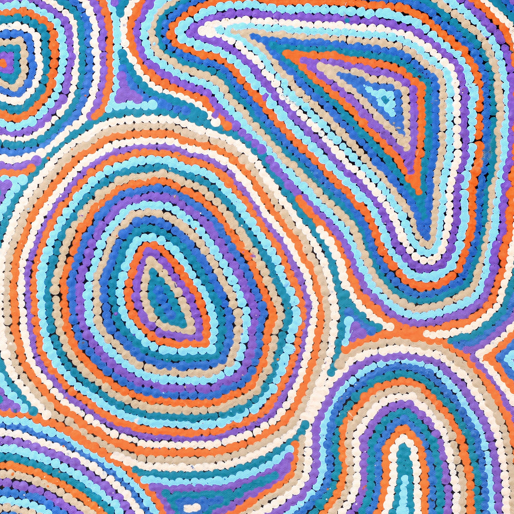 Although she was taught art at school it was her Grandmother that inspired her to paint. When she was young she would listen to her grandmother’s jukurrpa and watch her paint. She began painting with Warlukurlangu Artists Aboriginal Corporation, an Aboriginal owned and governed art centre located in Yuendumu and Nyirripi, in 2017. She paints her Grandmother’s Mina Mina Jukurrpa (Mina Mina Dreaming – Ngalyipi) - a very important women’s dreaming site west of Nyirripi near Lake Mackay and the WA border. These stories have been passed down to her by her grandmother and her grandmother’s mother before her for millennia. Virginia loves colour and uses an unrestricted palette and enjoys painting patterns to depict her jukurrpa.