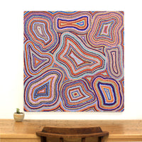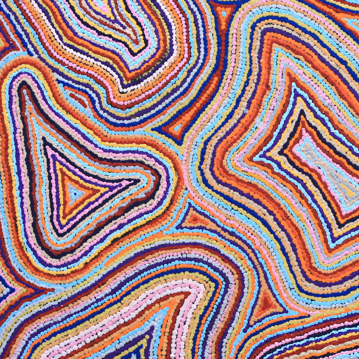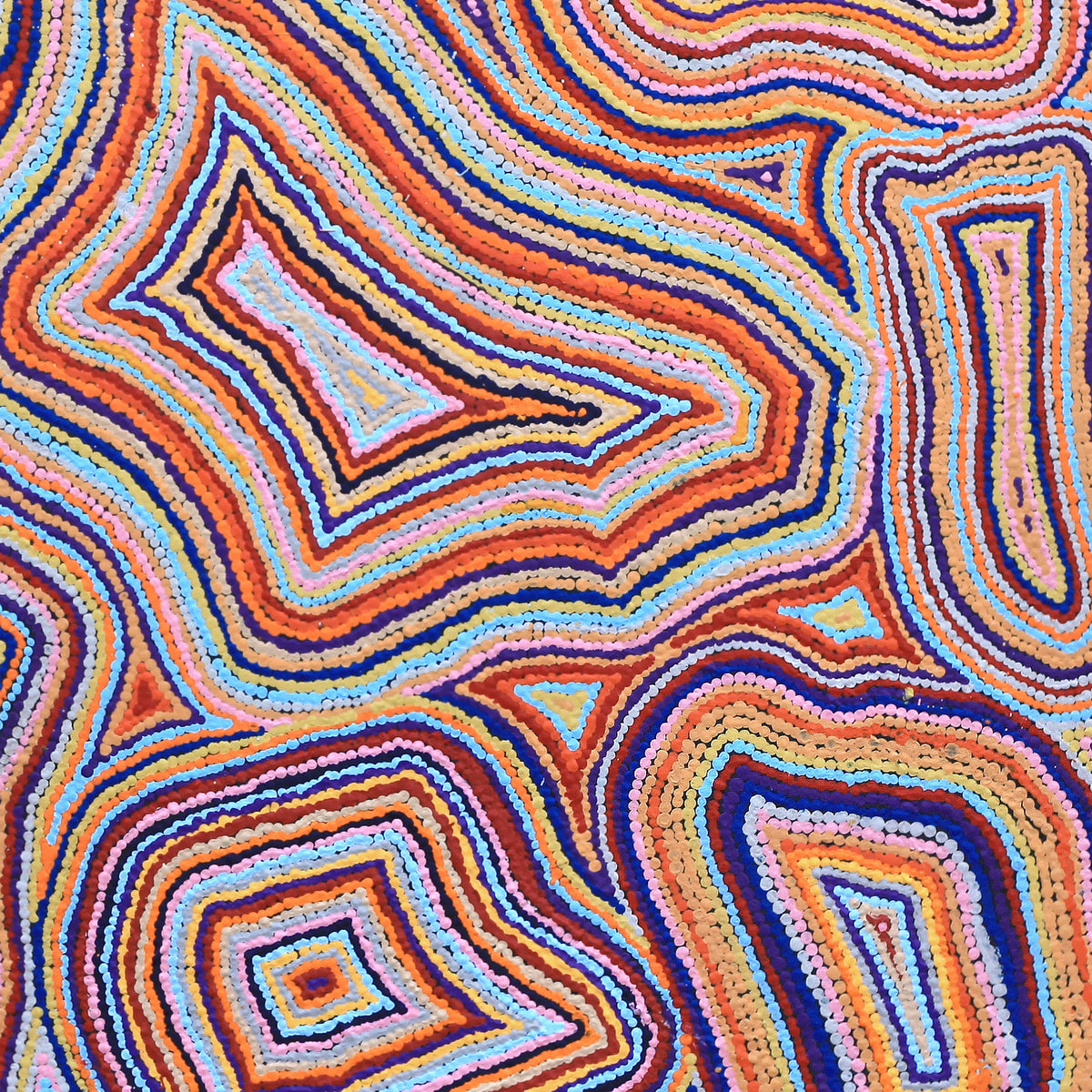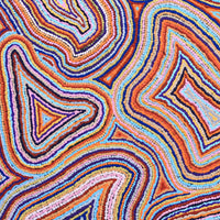 Although she was taught art at school it was her Grandmother that inspired her to paint. When she was young she would listen to her grandmother’s jukurrpa and watch her paint. She began painting with Warlukurlangu Artists Aboriginal Corporation, an Aboriginal owned and governed art centre located in Yuendumu and Nyirripi, in 2017. She paints her Grandmother’s Mina Mina Jukurrpa (Mina Mina Dreaming – Ngalyipi) - a very important women’s dreaming site west of Nyirripi near Lake Mackay and the WA border. These stories have been passed down to her by her grandmother and her grandmother’s mother before her for millennia. Virginia loves colour and uses an unrestricted palette and enjoys painting patterns to depict her jukurrpa.