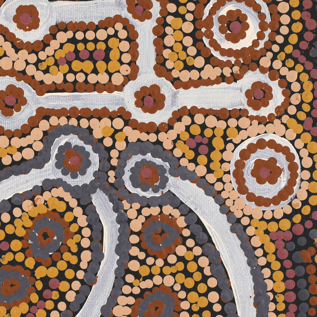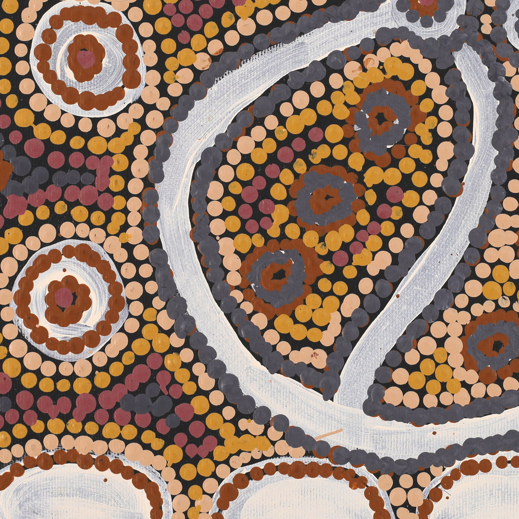 The subject of this work is Lappi Lappi, a rock hole near Lake Hazlett, about 90 km northwest of Lake Mackay in Western Australia. The country belongs to Nampijinpa/Jampijinpa and Nangala/Jangala skin groups. Located in a sheltered basin, the rock hole at Lappi Lappi is a permanent source of water, and is surrounded by country rich in bush tucker. In the time of the Jukurrpa (Dreamtime) many mothers with young children would gather there because it was a safe place to stay. The rock hole at Lappi Lappi is home to a ‘warnayarra’, a rainbow serpent that travels underground between various rock holes. One day, women were gathered at the rock hole with their children, singing and dancing. When the ‘warnayarra’ heard the sound of voices, it travelled silently towards them, under the water. When it reached the edge of the rock hole, it rose out of the water and ate them all.