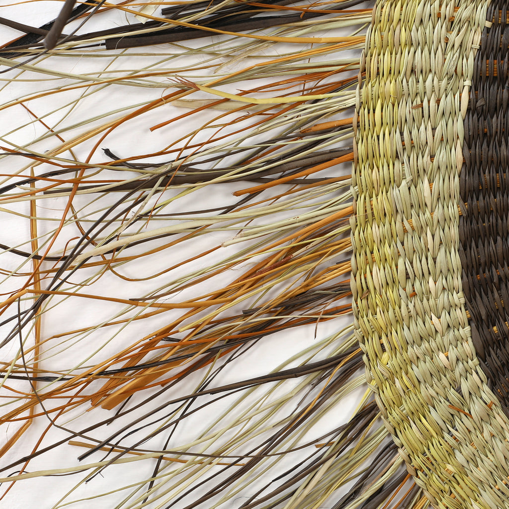 Pandanus are palm-like, dioecious trees and shrubs, their leaves “pandan” are commonly used in traditional handicraft. The young leaves are harvested and sliced into fine strips, followed by a colouring process, in which the strips are placed in drums of bush dyes, roots and leaves from different plants sourced in the area. Dye is extracted through bashing and crushing techniques, then added to the water with the pandanus to create these vivid hues. The pandan strips are then woven into intricate baskets and mats or rolled into ropes for other designs.