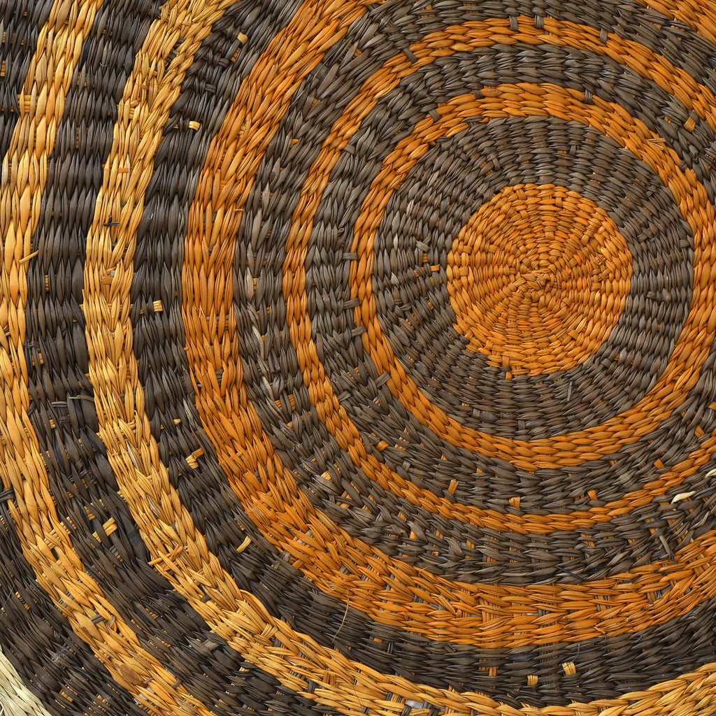 Mat (Maad) made from Gunga (Pandanus Spiralis), using a twining process. The twinning technique may be thought of as the twisting together of elements. Artists take two twisting lengths of pandanus and work them across a series of vertical or radiating lengths. The twisting lengths are the 'active' elements of the structure and the radiating lengths are 'passive'. The twining technique is traditional and a number of forms were made for ceremonial and utilitarian purposes. A conical mat was made for initiation ceremonies, and flattened, use for various purposes. Variation in the twinning occurs through changing the density, the order, or the colour. The Gunga is coloured with natural bush dyes. Flat mats are traditionally used for sitting on, shelter or preparing food etc.