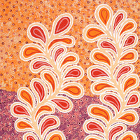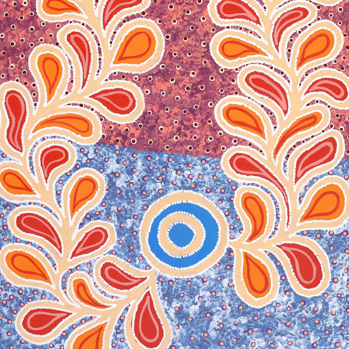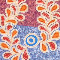 In this painting, Brenda depicts the Dreaming of her maternal grandmother, Ruby Williamson. This 'kaliny-kalinypa' Dreaming comes from Pukara, a 'kapi tjukula' (rockhole, waterhole) southwest of Wingellina community in Western Australia. Pukara is her grandmother’s grandfather’s country. Here women dance and perform 'inma' (ceremonies) to increase the amount of nectar in the 'kaliny-kalinypa' flowers. Two rainbow serpents live in the waterhole at Pukara, which is why her paintings of this area are so colourful.