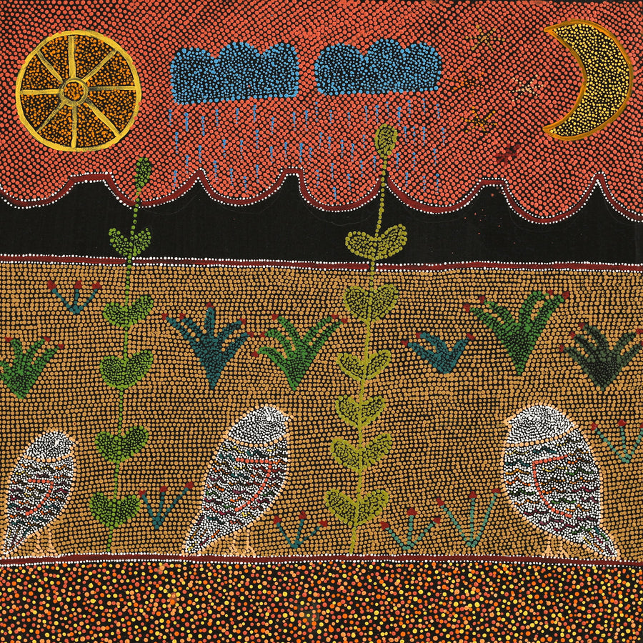 This painting depicts one of many ‘jurlpu’ (bird) species that live around Yuendumu. The bush around Yuendumu provides many different habitats for birds to live in. Many bird species live around waterholes and rivers, like the ‘pirniny-pirninypa’ (black fronted dotterel [Elseyornis melanops]) and Ngatijirri (budgerigar [Melopsittacus undulates]). Others live in the spinifex country, like the ‘nuwiyingki’ or ‘panngarra’ (cockatiel [Nymphicus hollandicus]). Still others make nests in trees, like the ‘juwayikirdi’ (grey crowned babbler [Pomatostomus temporalis]).