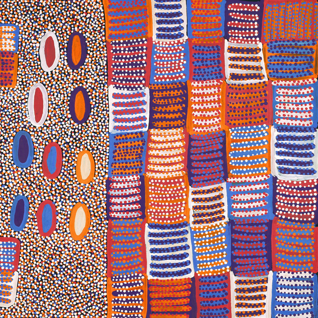 Helen has been painting with Warlukurlangu Artists Aboriginal Corporation, an Aboriginal owned and governed art centre located in Yuendumu, since 2014. She paints her father’s Ninkuwakal country. She likes painting because it reminds her of her father and the colours remind her of her country.