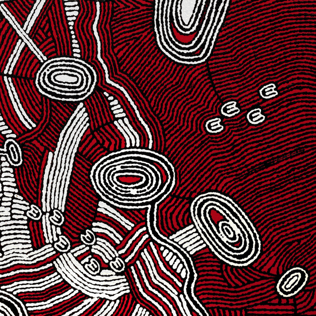 Janganpa Jukurrpa (common brush-tail possum [Trichosurus vulpecula] Dreaming) travels all over Warlpiri country. ‘Janganpa’ are nocturnal animals that often nest in the hollows of white gum trees (‘wapunungka’). This story comes from a big hill called Mawurrji, west of Yuendumu and north of Pikilyi (Vaughan Springs). A group of ‘janganpa’ ancestors resided there. Every night they would go out in search of food. Their hunting trips took them to Wirlki and Wanapirdi, where they found ‘pamapardu’ (flying ants). They journeyed on to Ngarlkirdipini looking for water. A Nampijinpa women was living at Mawurrji with her two daughters. She gave her daughters in marriage to a Jupurrurla ‘janganpa’ but later decided to run away with them. The Jupurrurla angrily pursued the woman. He tracked them to Mawurrji where he killed them with a stone axe. Their bodies are now rocks at this place. Warlpiri people perform a young men’s initiation ceremony, which involves the Janganpa Jukurrpa. The Janganpa Jukurrpa belongs to Jakamarra/Jupurrurla men and Nakamarra/Napurrurla women. In Warlpiri paintings traditional iconography is used to represent this Jukurrpa. ‘Janganpa’ tracks are often represented as 'E' shaped figures and concentric circles are used to depict the trees in which the ‘janganpa’ live, and also the sites at Mawurrji.