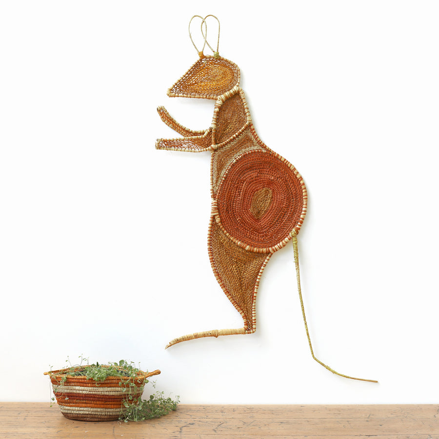Made from Gunga (Pandanus Spiralis), using a twining process, this work shares a Kangaroo. The twinning technique may be thought of as the twisting together of elements. Artists take two twisting lengths of pandanus and work them across a series of vertical or radiating lengths. The twisting lengths are the 'active' elements of the structure and the radiating lengths are 'passive'. The twining technique is traditional and a number of forms were made for ceremonial and utilitarian purposes. Variation in the twinning occurs through changing the density, the order, or the colour. The Gunga is coloured with natural bush dyes.