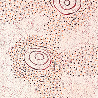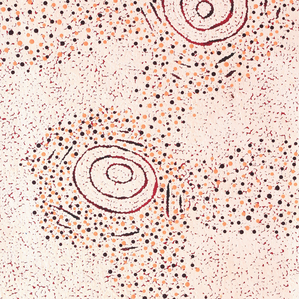 This painting depicts the Pamapardu Jukurrpa (Flying Ant Dreaming) from Wapurtali, west of Yuendumu. 'Pamapardu' is the Warlpiri name for the flying ants or termites that build the large anthills found throughout Warlpiri country. This country belongs to Nakamarra/Napurrurla women and Jakamarra/Jupurrurla men. 'Pamapardu' are flying ants. They build earth mounds (‘mingkirri’) that are common in the Tanami area. When heavy rains come in summer the ‘mingkirri’ get flooded out, so the ‘pamapardu’ grow wings and fly off to make new homes, following their queens to dry mounds or to build a new. When they have found their new home they drop their wings. In this stage they can be collected, lightly cooked in coals and eaten. As they fall to the ground women collect them to eat because they are nice and sweet. In contemporary Warlpiri paintings traditional iconography is used to represent the Jukurrpa, particular sites and other elements. When this Jukurrpa story is painted concentric circles are used to represent the ‘mingkirri’ and the rockholes involved in the story, including the central one at Wapurtali (Mt Singleton). Dashes are often depicted around the circles to represent the ‘pamapardu’.