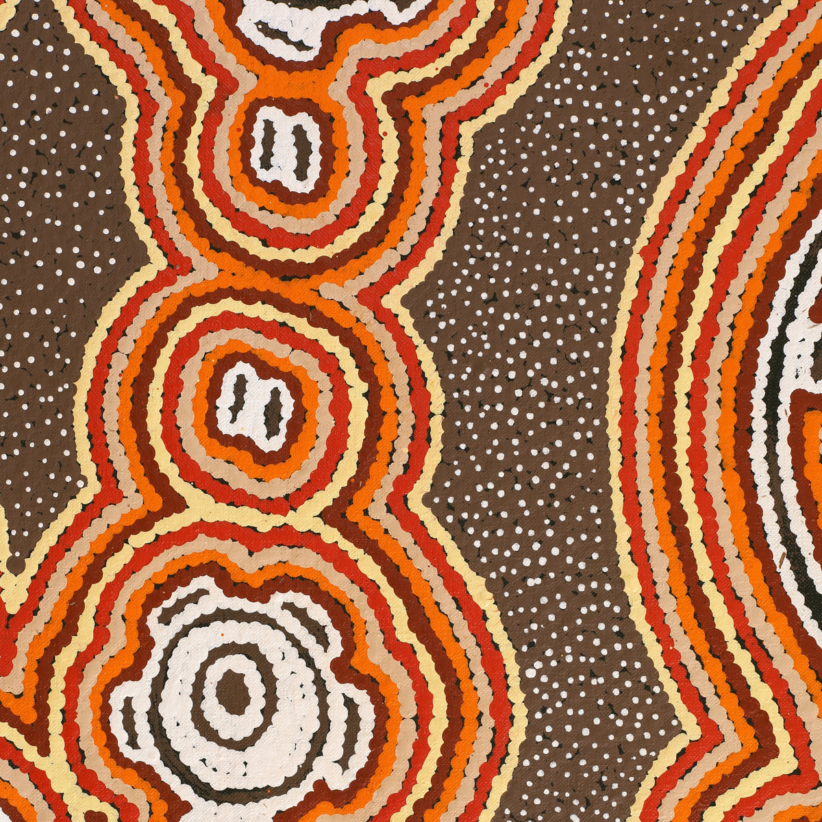 This painting depicts the Pamapardu Jukurrpa (Flying Ant Dreaming) from Wapurtali, west of Yuendumu. 'Pamapardu' is the Warlpiri name for the flying ants or termites that build the large anthills found throughout Warlpiri country. This country belongs to Nakamarra/Napurrurla women and Jakamarra/Jupurrurla men. 'Pamapardu' are flying ants. They build earth mounds (‘mingkirri’) that are common in the Tanami area. When heavy rains come in summer the ‘mingkirri’ get flooded out, so the ‘pamapardu’ grow wings and fly off to make new homes, following their queens to dry mounds or to build a new. When they have found their new home they drop their wings. In this stage they can be collected, lightly cooked in coals and eaten. As they fall to the ground women collect them to eat because they are nice and sweet. In contemporary Warlpiri paintings traditional iconography is used to represent the Jukurrpa, particular sites and other elements. When this Jukurrpa story is painted concentric circles are used to represent the ‘mingkirri’ and the rockholes involved in the story, including the central one at Wapurtali (Mt Singleton). Dashes are often depicted around the circles to represent the ‘pamapardu’.