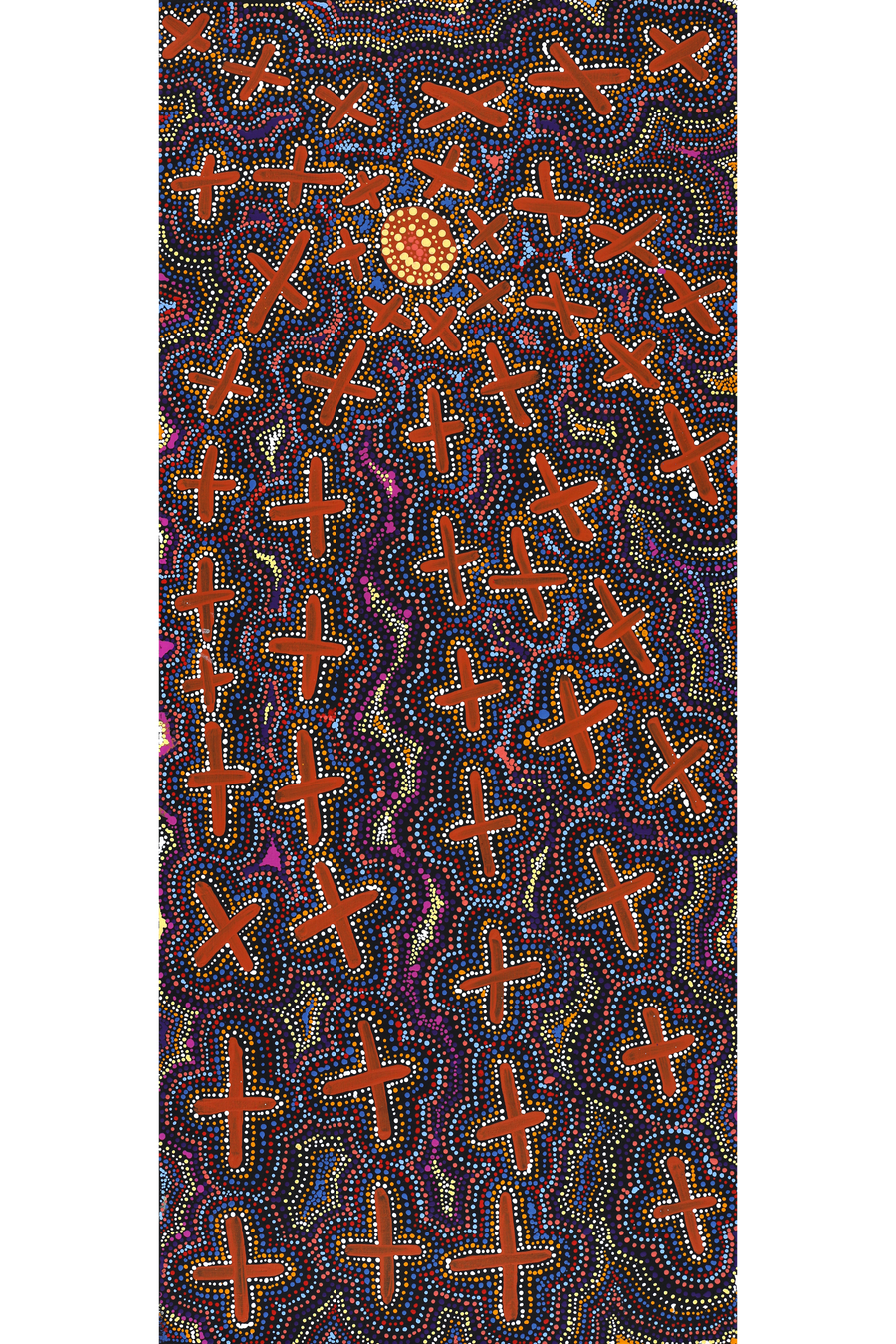The Jukurrpa site shown in this painting for Ngatijirri (budgerigar [Melopsittacus undulates]) is at Yangarnmpi, south of Yuendumu. ‘Ngatijirri’ are small, bright green birds native to central Australia which are common around the Yuendumu area, especially after the summer rains. Men would hunt for ‘ngatijirri’ nests, robbing them of eggs and juvenile birds, which are both considered delicacies. The men would also go out hunting for adult, flying ‘ngatijirri’, which they would kill by swinging branches, killing sticks or ‘karli’ (boomerangs) to hit the birds in flight. The ‘ngatijirri’ travelled to Yangarnmpi from Patirlirri, near Willowra to the east of Yuendumu and travelled further on to Marngangi, north/west of Mount Dennison and west of Yuendumu. Each time the flock of ancestral ‘ngatijirri’ lands, they perform ceremonies, singing and dancing as they fly and roost in the trees. The sites of these ceremonies are depicted in this painting as concentric circles, while cross-like shapes depict the footprints of the birds on the ground and give an indication of the large flocks of ‘ngatijirri’ that can be found near Yangarnmpi and other sites close to Yuendumu. After good rains ‘ngatijirri’ can successfully breed several times, resulting in an explosion of the population in a short time. Custodians for the Ngatijirri Jukurrpa are Napaljarri/Nungarrayi women and Japaljarri/Jungarrayi men.