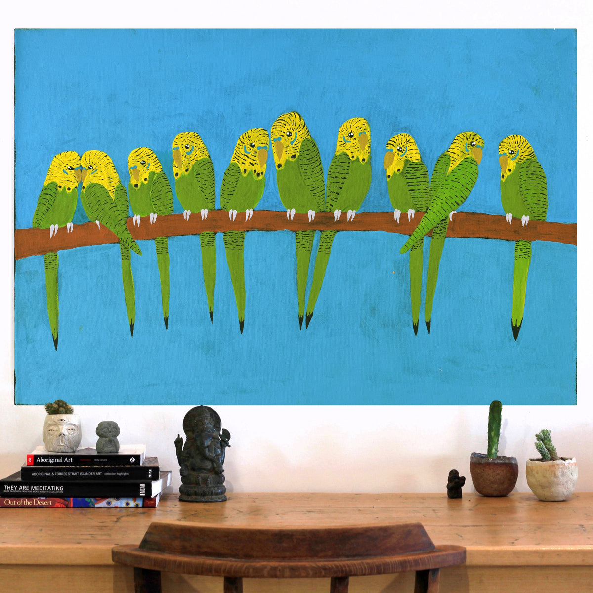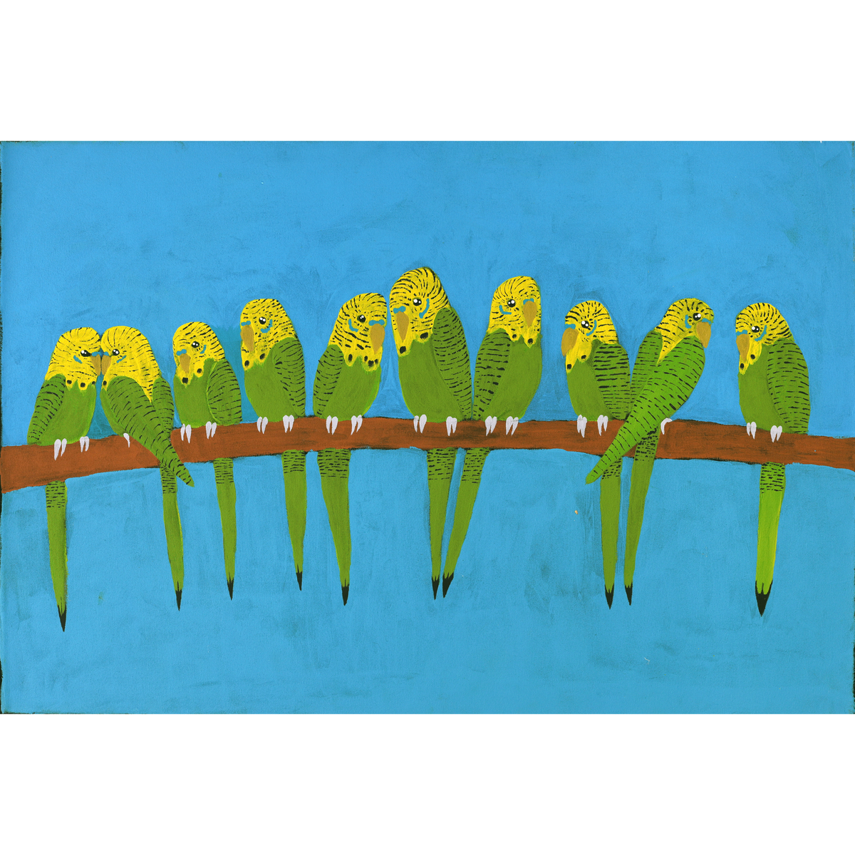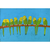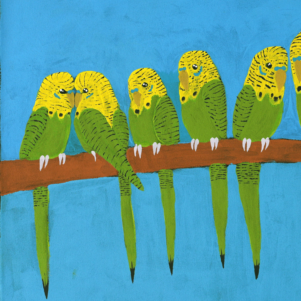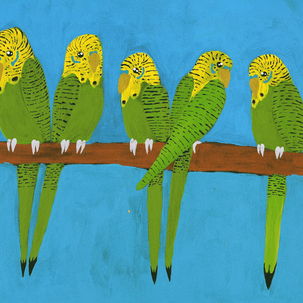 This is a painting of tjulpiu (birds) native to the Kalka and Pipalyatjara communities of South Australia. They are a part of every day life, but also play their part in some dreaming stories.