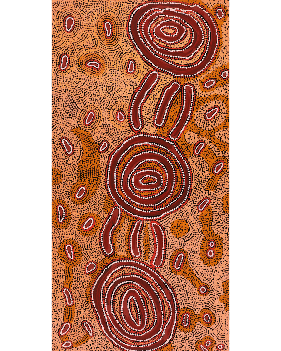 This artwork comes from Warlukurlangu Artists in Yuendumu. The art centre represents Warlpiri artists from Yuendumu and Nyirripi, located in the Tanami Desert northwest of Alice Springs. This remote region of red sand and open desert Country is central to the stories and knowledge shared through the paintings.