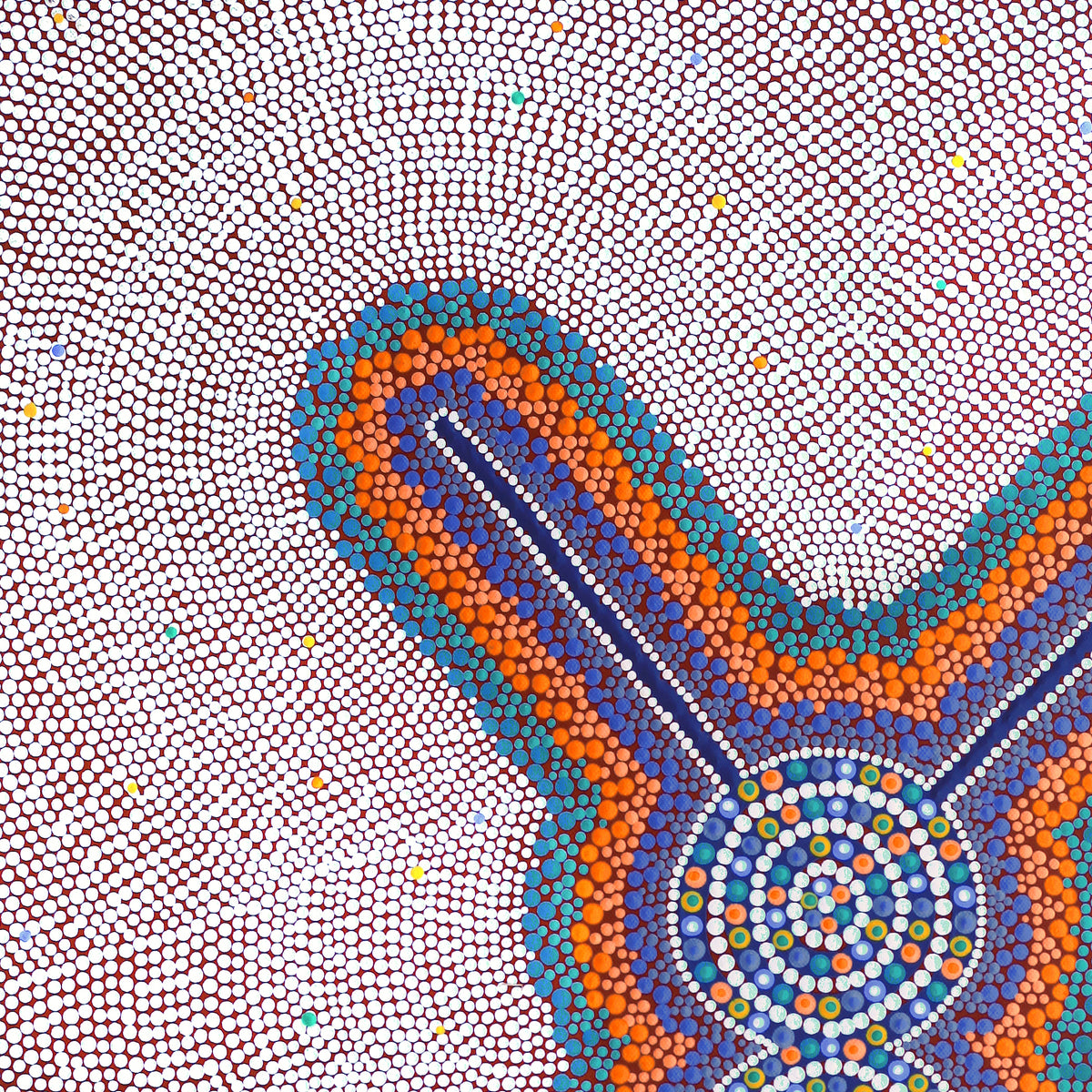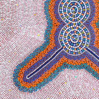 The site depicted in this painting is Puyurru, west of Yuendumu. In the usually dry creek beds are ‘mulju’ (soakages), or naturally occurring wells. The 'kirda' (owners) for this site are Nangala/Nampijinpa women and Jangala/Jampijinpa men. Two Jangala men, rainmakers, sang the rain, unleashing a giant storm. The storm travelled across the country from the east to the west, initially travelling with a ‘pamapardu Jukurrpa’ (termite Dreaming) from Warntungurru to Warlura, a waterhole 8 miles east of Yuendumu. At Warlura, a gecko called Yumariyumari blew the storm on to Lapurrukurra and Wilpiri. Bolts of lightning shot out at Wirnpa (also called Mardinymardinypa) and at Kanaralji. At this point the Dreaming track also includes the ‘kurdukurdu mangkurdu Jukurrpa’ (children of the clouds Dreaming). The water Dreaming built hills at Ngamangama using baby clouds and also stuck long pointy clouds into the ground at Jukajuka, where they can still be seen today as rock formations.
