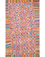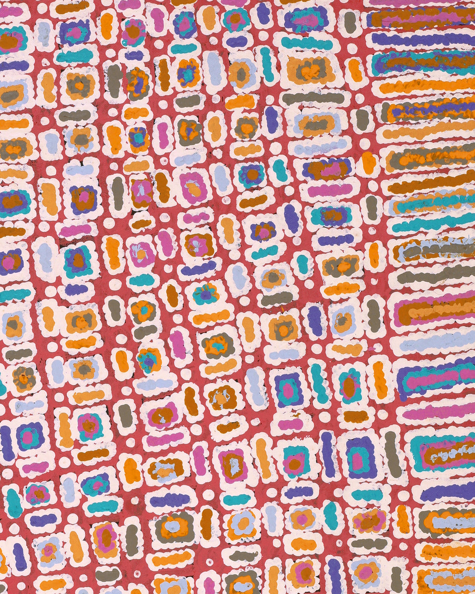 The site depicted in this painting is Puyurru, west of Yuendumu. In the usually dry creek beds are ‘mulju’ (soakages), or naturally occurring wells. The 'kirda' (owners) for this site are Nangala/Nampijinpa women and Jangala/Jampijinpa men. Two Jangala men, rainmakers, sang the rain, unleashing a giant storm. The storm travelled across the country from the east to the west, initially travelling with a ‘pamapardu Jukurrpa’ (termite Dreaming) from Warntungurru to Warlura, a waterhole 8 miles east of Yuendumu. At Warlura, a gecko called Yumariyumari blew the storm on to Lapurrukurra and Wilpiri. Bolts of lightning shot out at Wirnpa (also called Mardinymardinypa) and at Kanaralji. At this point the Dreaming track also includes the ‘kurdukurdu mangkurdu Jukurrpa’ (children of the clouds Dreaming). The water Dreaming built hills at Ngamangama using baby clouds and also stuck long pointy clouds into the ground at Jukajuka, where they can still be seen today as rock formations.