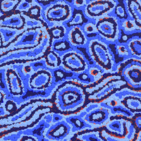 The subject of this work is Lappi Lappi, a rock hole near Lake Hazlett, about 90 km northwest of Lake Mackay in Western Australia. The country belongs to Nampijinpa/Jampijinpa and Nangala/Jangala skin groups. Located in a sheltered basin, the rock hole at Lappi Lappi is a permanent source of water, and is surrounded by country rich in bush tucker. In the time of the Jukurrpa (Dreamtime) many mothers with young children would gather there because it was a safe place to stay. The rock hole at Lappi Lappi is home to a ‘warnayarra’, a rainbow serpent that travels underground between various rock holes. One day, women were gathered at the rock hole with their children, singing and dancing. When the ‘warnayarra’ heard the sound of voices, it travelled silently towards them, under the water. When it reached the edge of the rock hole, it rose out of the water and ate them all.