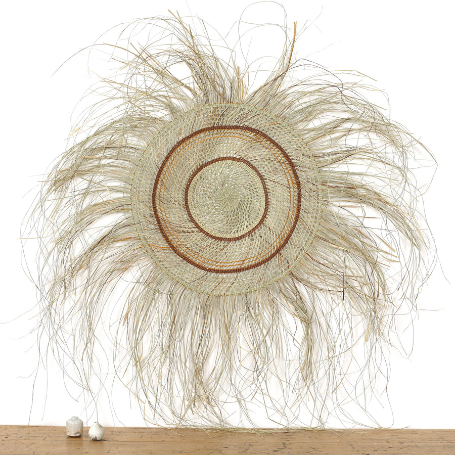 Pandanus are palm-like, dioecious trees and shrubs, their leaves “pandan” are commonly used in traditional handicraft. The young leaves are harvested and sliced into fine strips, followed by a colouring process, in which the strips are placed in drums of bush dyes, roots and leaves from different plants sourced in the area. Dye is extracted through bashing and crushing techniques, then added to the water with the pandanus to create these vivid hues. The pandan strips are then woven into intricate baskets and mats or rolled into ropes for other designs.