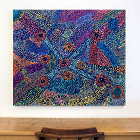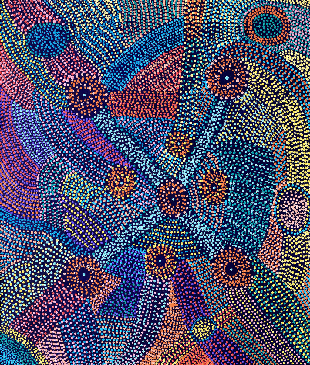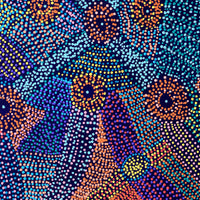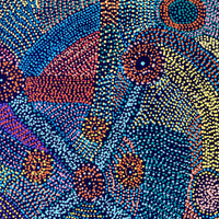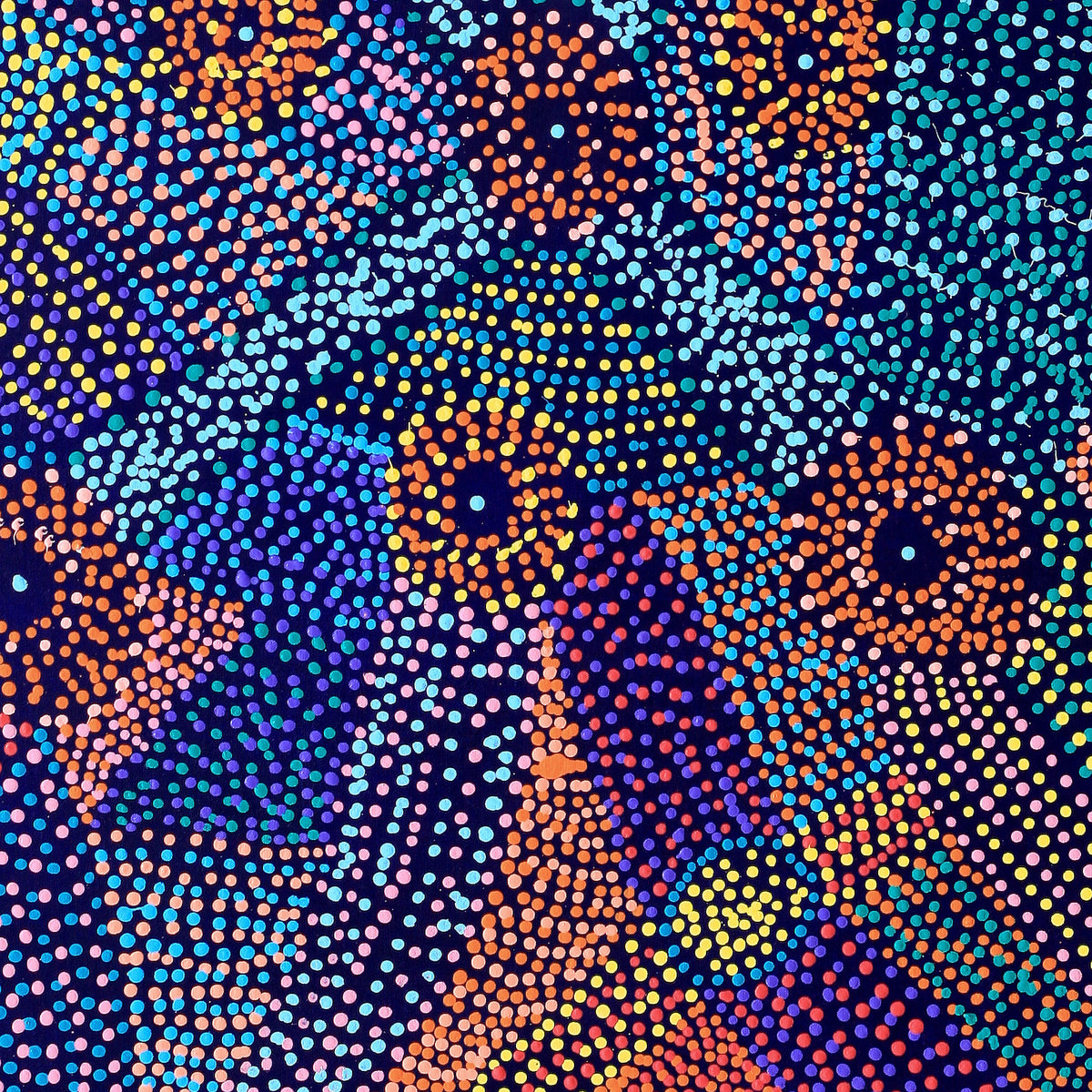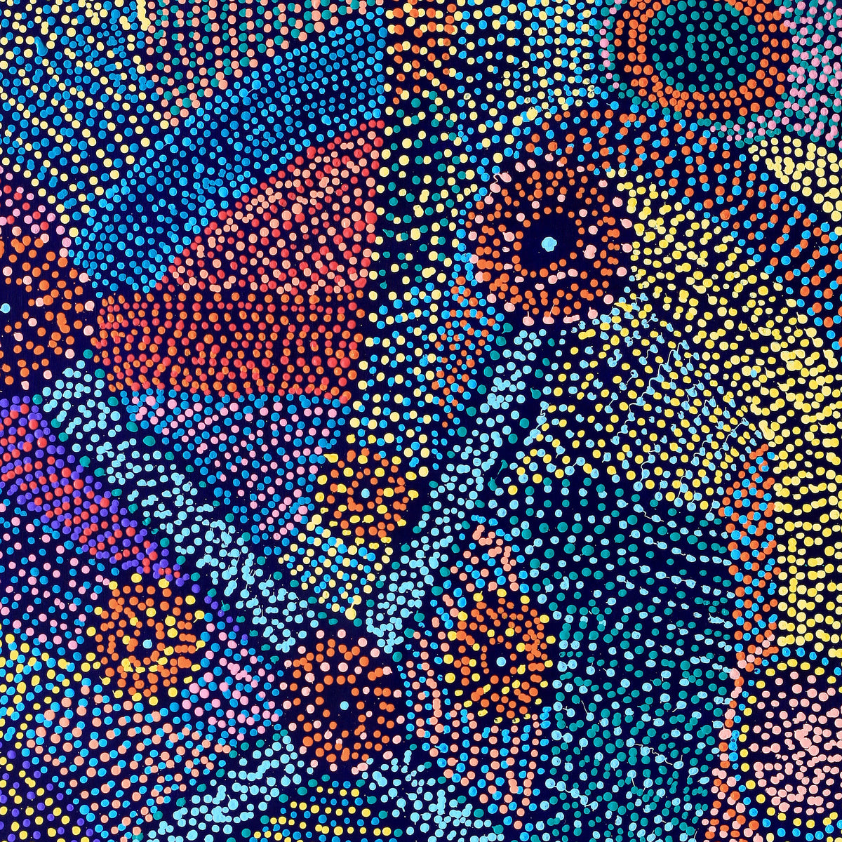 Megan began painting with Warlukurlangu Artists Aboriginal Corporation, an Aboriginal owned and governed art centre located in Yuendumu and Nyirripi, in 2016. “I like colours and patterns . . . they make me happy . . . I paint my Grandmother’s Story”. Her grandmother’s country is Karrku – a large hill and the home of a sacred ochre mine (Mount Stanley), a 20-minute drive from Nyirrpi. Megan uses colour and patterns which she creatively combines to blend traditional motifs with her own ideas of modern design to represent her grandmother’s country.
