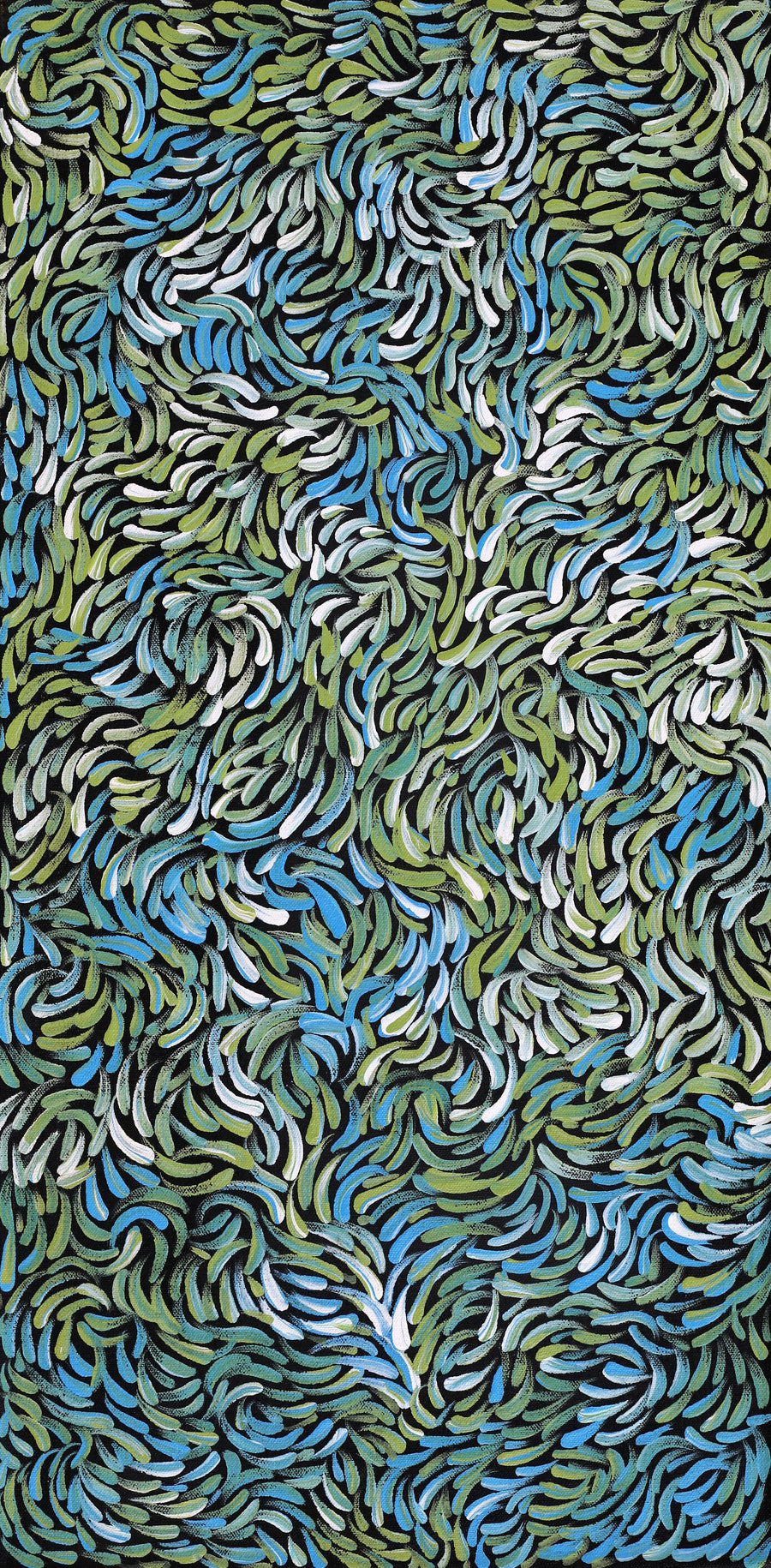 This ‘purrpalanji Jukurrpa’ (skinny bush banana Dreaming) comes from Pikilyi (Vaughan Springs), a large waterhole and natural spring to the west of Yuendumu, close to Mount Doreen. Napangardi/Napanangka women and Japangardi/Japanangka men are the ‘kirda’ (owners) of the skinny bush banana Dreaming at Pikilyi. Nangala women and Jangala men are the ‘kurdungurlu’ (custodians) of this Dreaming.