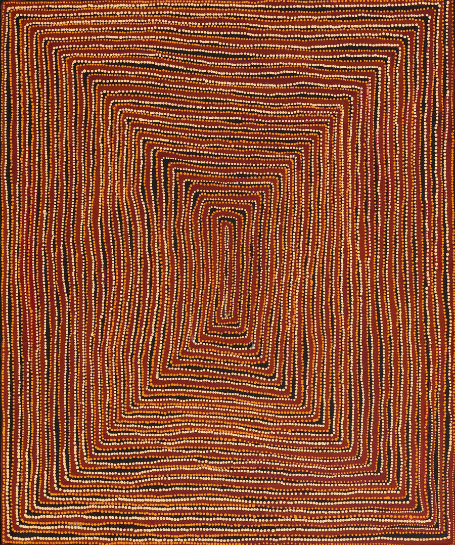 The ‘kirda’ (owners) of this country are Napangardi/Napanangka women and Japangardi/Japanangka men, who can depict portions of the Mina Mina Jukurrpa in their paintings. There are a number of different components of the Mina Mina Jukurrpa; artists usually choose to depict one particular aspect. These can include ‘karnta’ (women), ‘karlangu’ (digging sticks), ‘majardi’ (hairstring skirts/tassels), ‘ngalyipi’ (snakevine [Tinospora smilacina]), ‘jintiparnta’ (desert truffle [Elderia arenivaga]), and ‘kurrkara’ (desert oak [Allocasuarina decaisneana]).