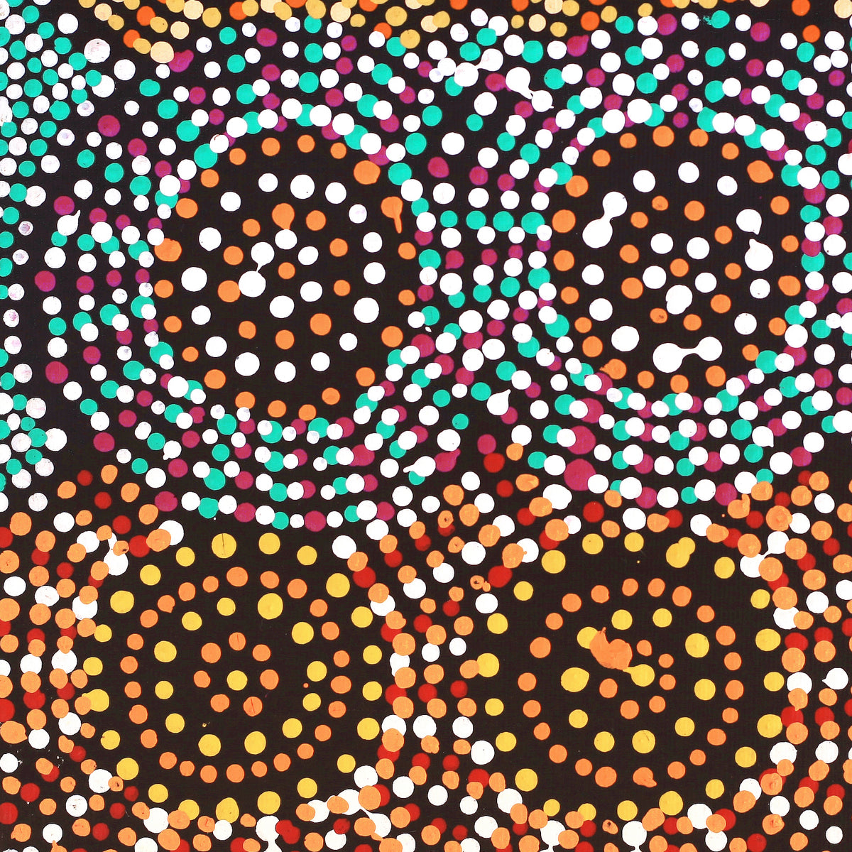 In this painting women of the Napanangka and Napangardi subsection are collecting ‘jinti-parnta’ (edible fungus [Elderia arenivaga]) far to the west of Yuendumu at Karnta Karlangu, near to another place called Mina Mina. ‘Jinti-parnta’ is also known as native truffle and appears in the sandhills after the winter rains. The growing fungus forces the earth above it to crack, exposing it. Then, women collect it, squeezing out the juicie before cooking. Jinti-parnta is prepared by cooking in hot ashes. Ancestral women travelled north through Janyinki and other places, then to the east through to Alcoota country, while collecting ‘jinti-parnta’. They got to Mina Mina, which is a ceremonial place belonging to Japanangka/ Japangardi men and Napanangka/Napangardi women. Their associated land continues far to the west of Yuendumu into sand hill country. There are a number of ‘mulju’ (water soakages) and a large clay pan at Mina Mina and it is at these sites that the women danced and performed ceremonies. As a result ‘karlangu’ (digging sticks) rose up out of the ground, which the women carried with them on their long journey east. They danced and sang the whole way with no sleep. The women collected other types of bush tucker as ‘yakajirri’ (bush sultana). In the paintings of this Dreaming concentric circles are often used to represent the jinti-parnta that the women have collected.